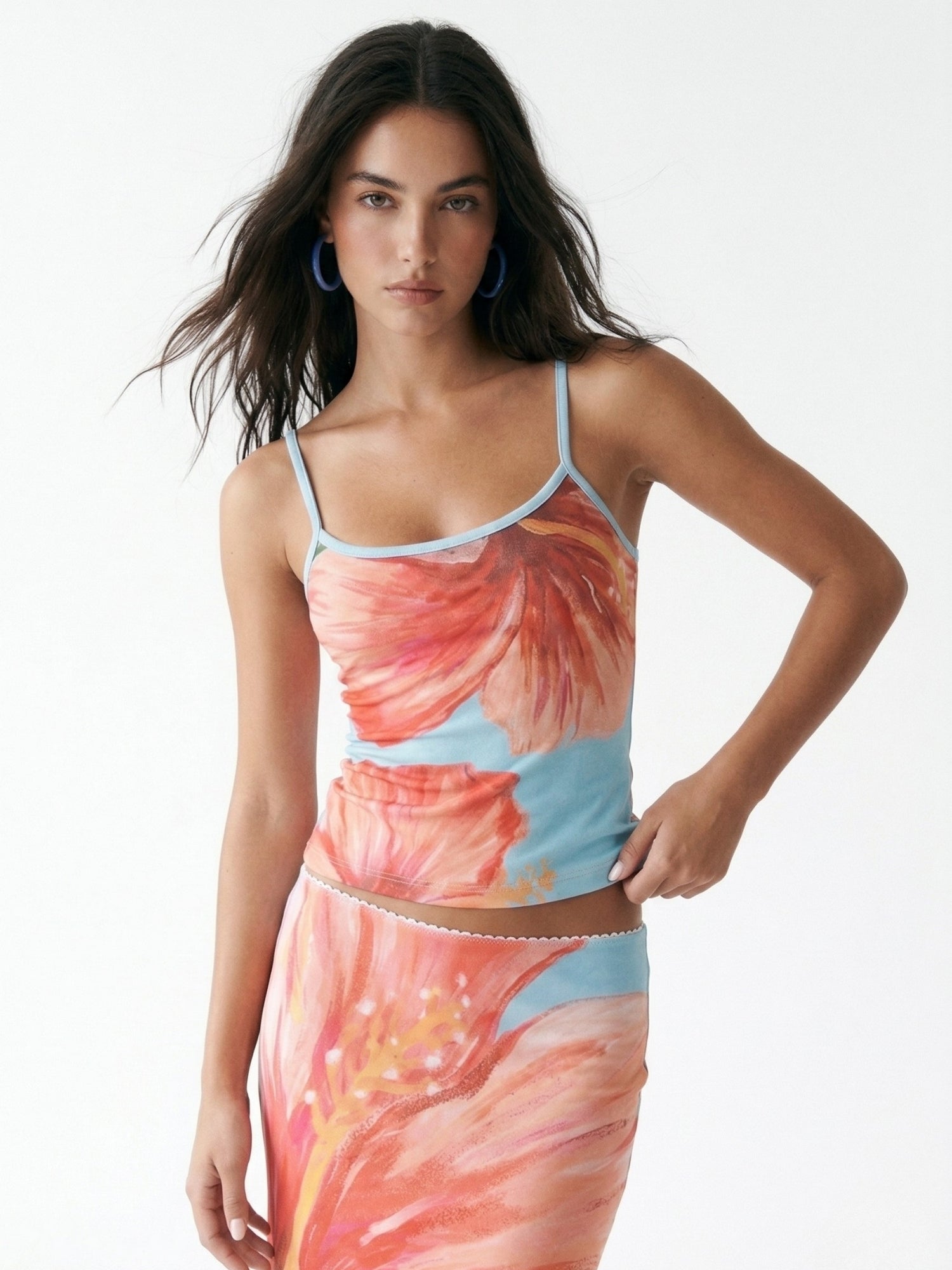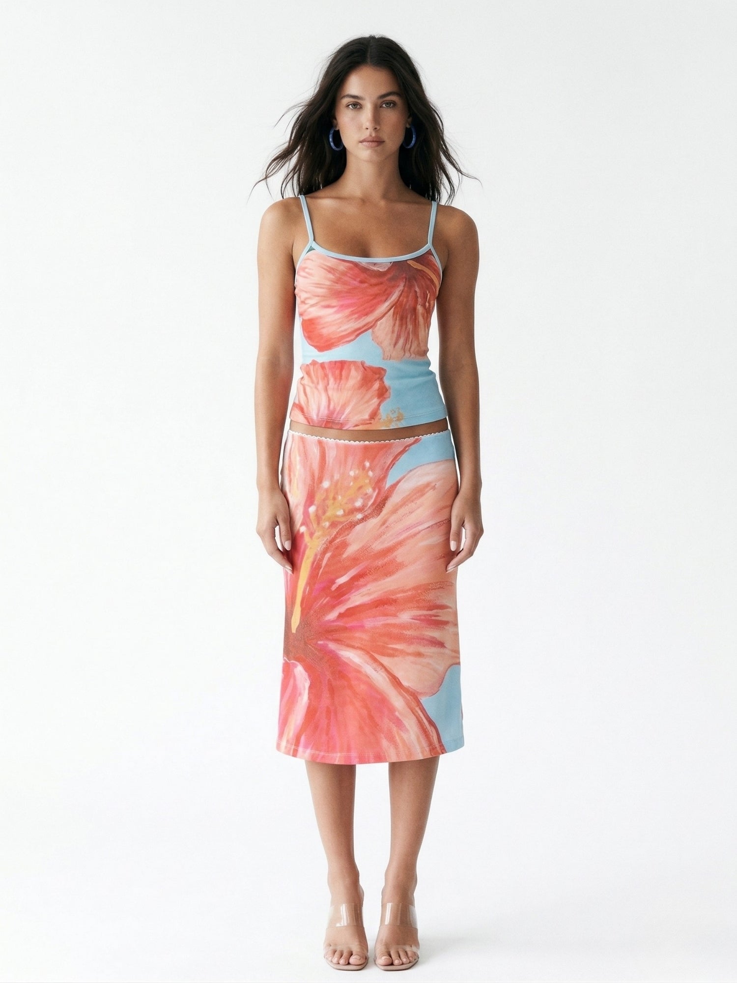 Embrace the colors of summer with this multicolor floral printed spaghetti strap top and skirt set. Perfect for a tropical getaway or a summer festival, this vibrant co-ord set is both stylish and fun. Finish the look with oversized sunglasses and sandals.