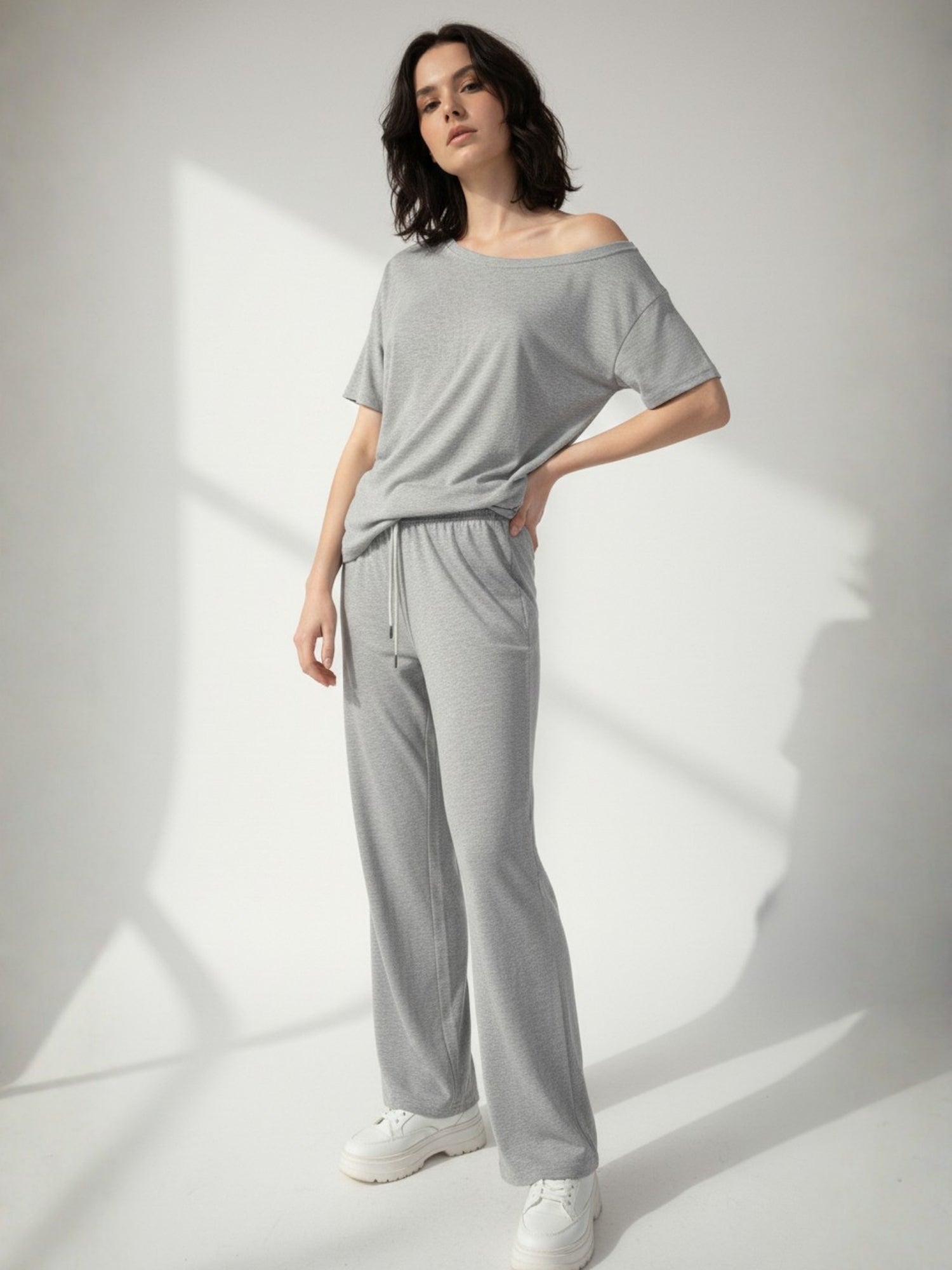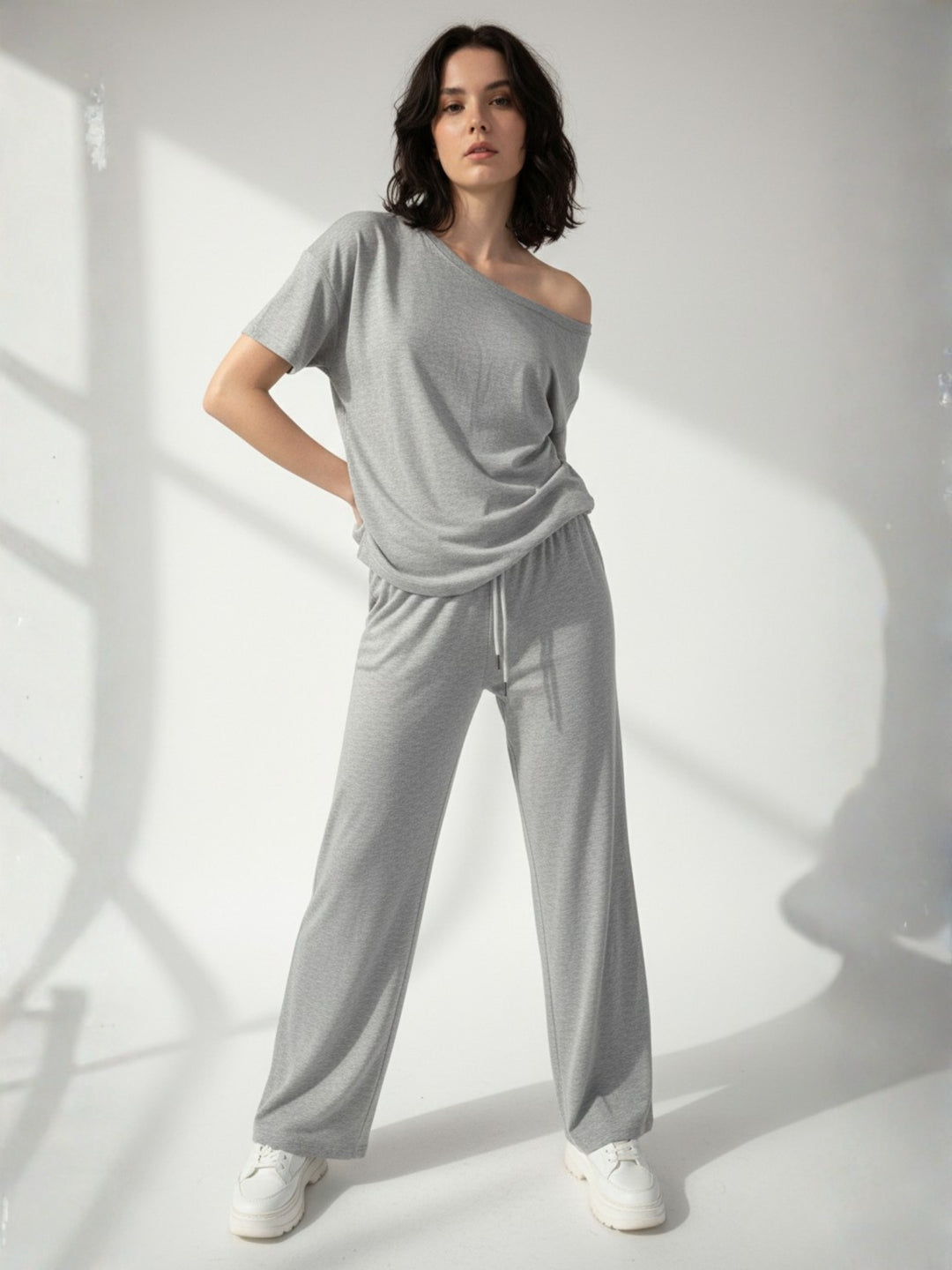 Grey Off-Shoulder Relaxed Top And Pant Co-Ord Set
