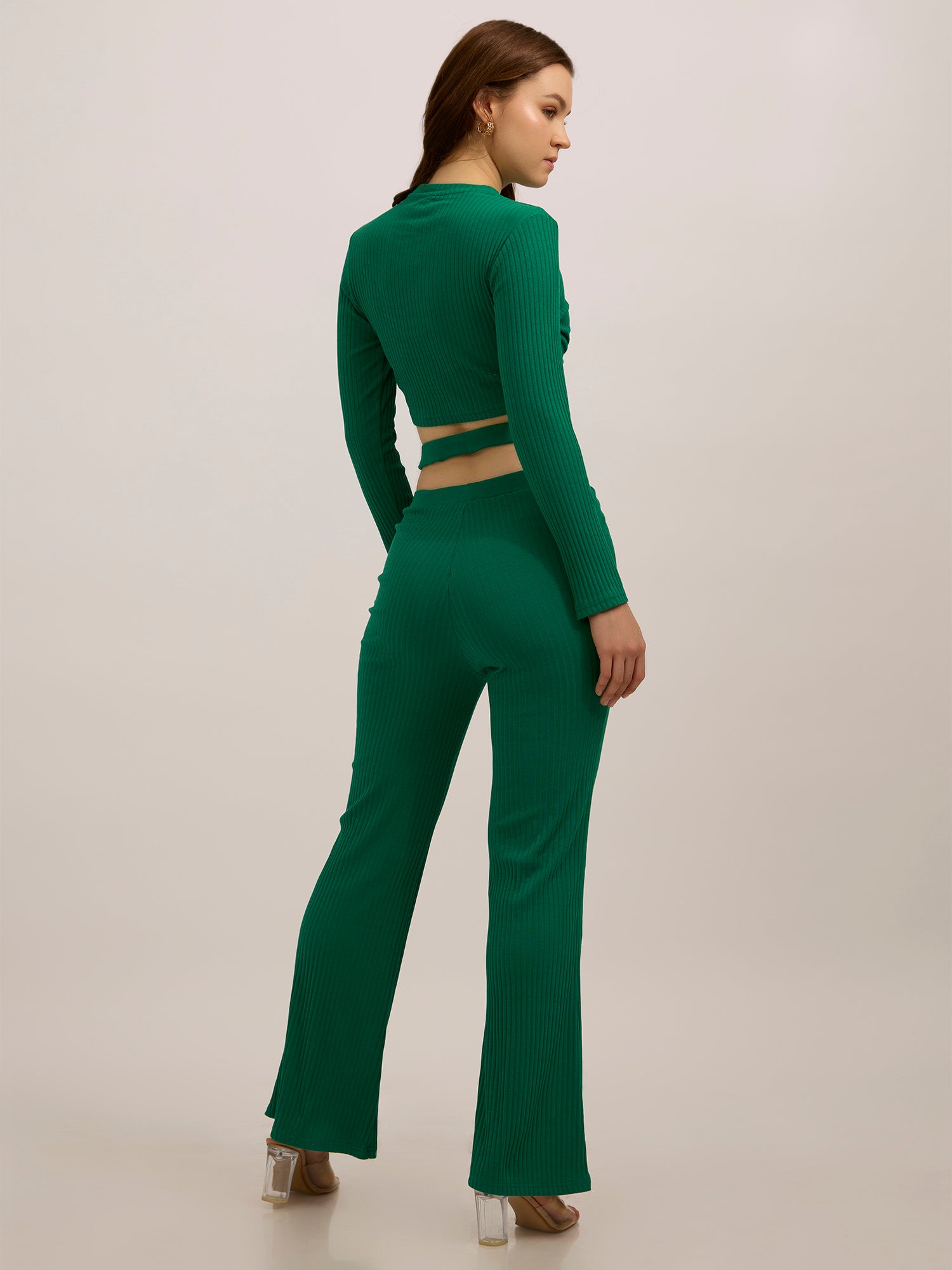 Stay cozy and chic in this green fitted full-sleeve rib top and fit and flare pants set. The trendy ribbed texture and flattering silhouette make it an essential piece for any casual outing. Pair it with your favorite boots for an effortless, street-style look perfect for a weekend brunch.