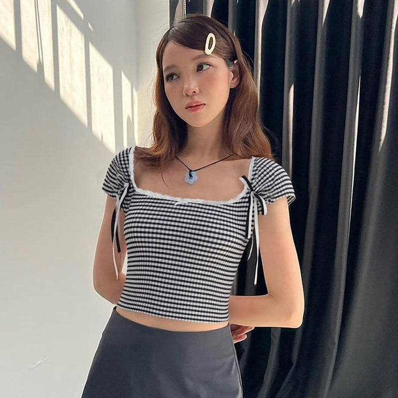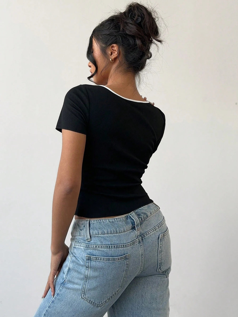 For fits that are low-effort, high impact,the Black Square Neck Fitted Top With Lace Bow has entered the chat. Made to move through street wear plans with ease, it’s soft, wearable, and made to go out in.