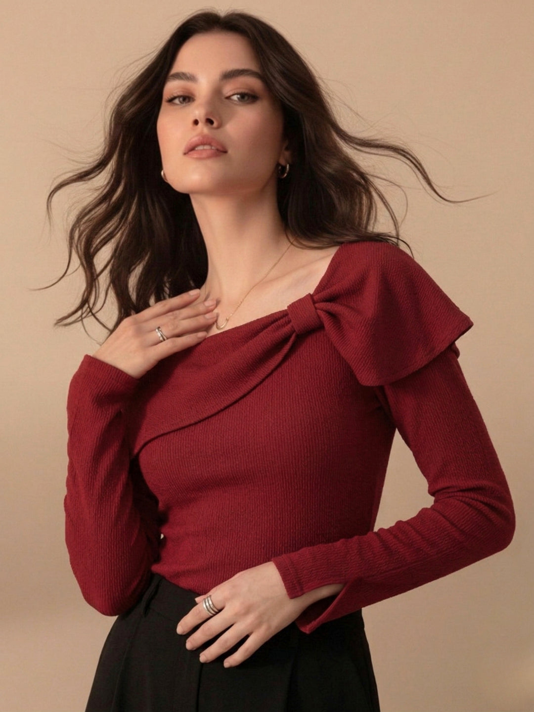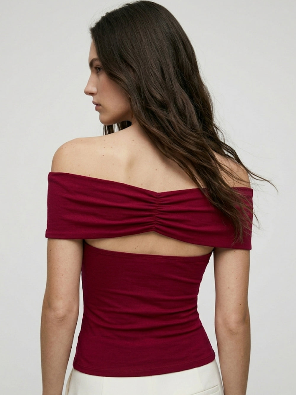 This burgundy off shoulder centre ruched top with metal trim is a sexy and elegant choice for a date night. The rich color and ruched detail make it ideal for a party or cocktail evening. Pair it with black trousers and heels for a polished dinner out.