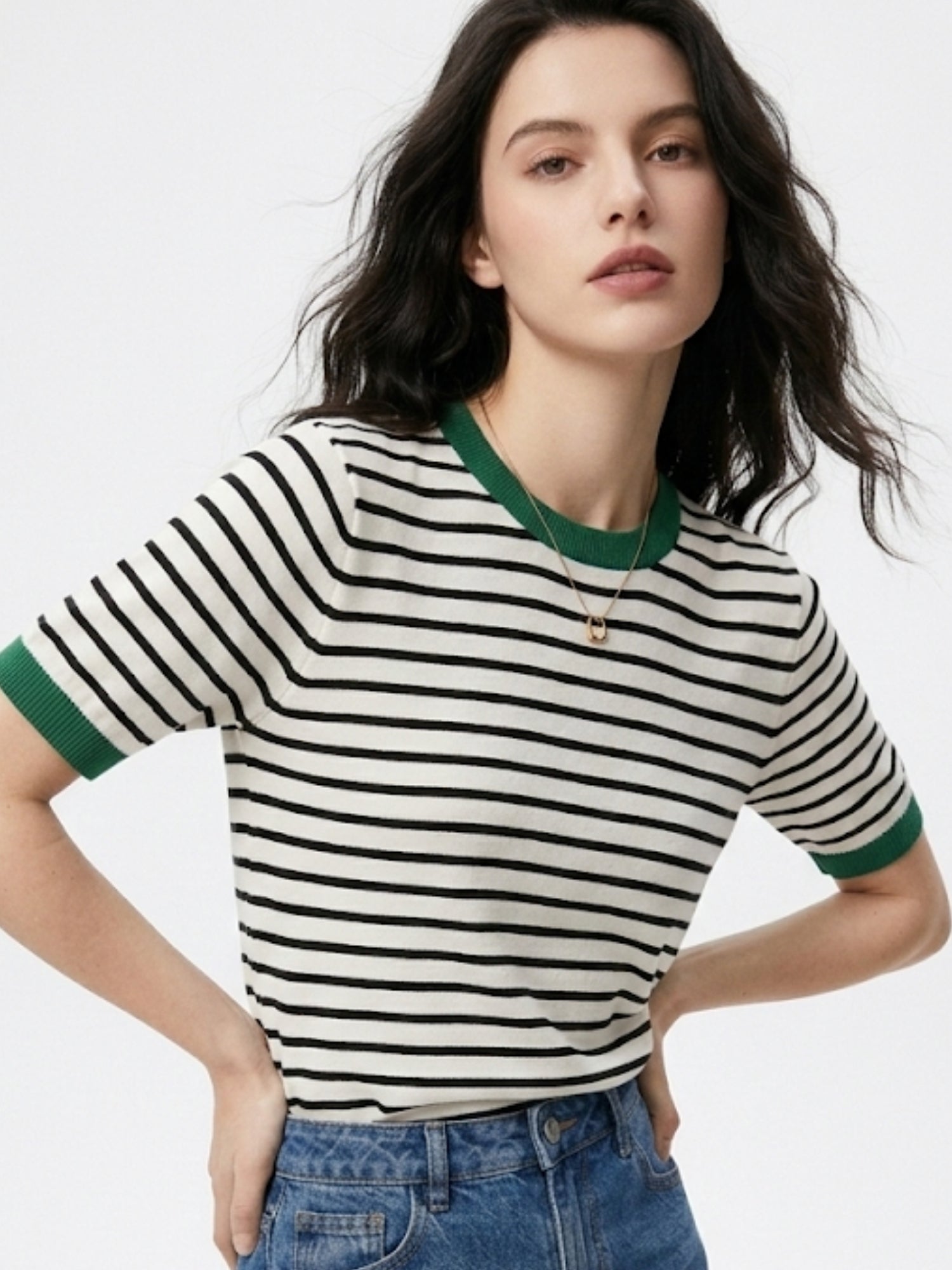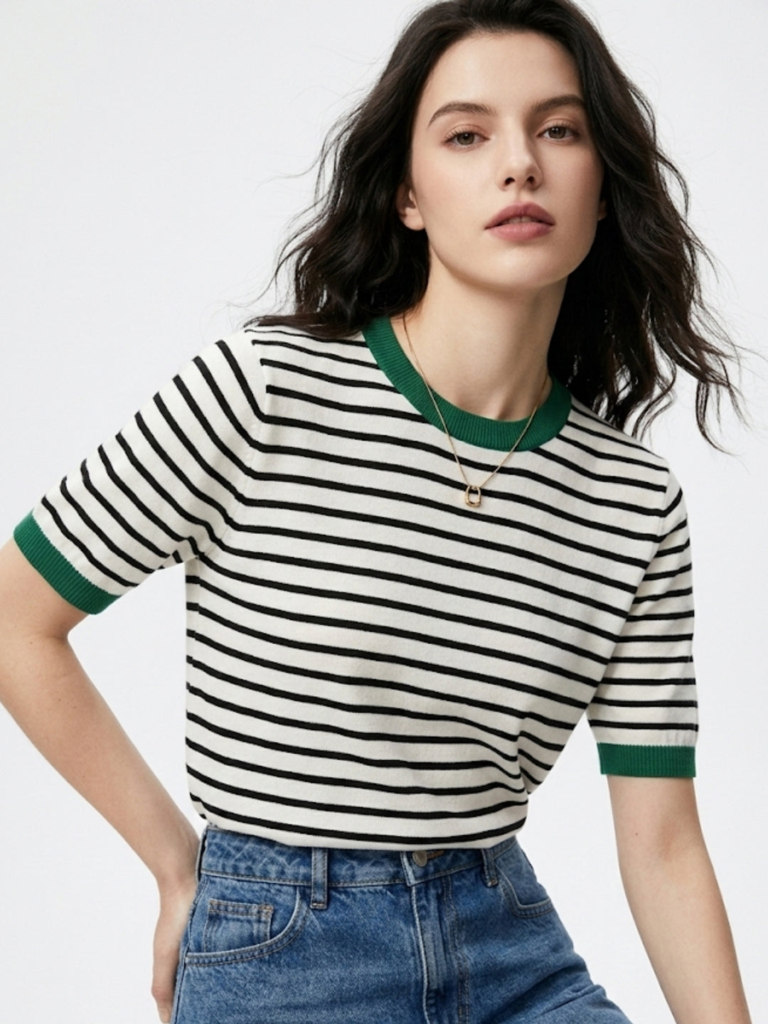 This dark green top features sophisticated horizontal stripes and a unique contrast hem for a modern look. Perfect for weekend getaways or a relaxed outdoor social, its rich tone ensures you stand out. Pair it with simple trousers to let the striking design be the focus.