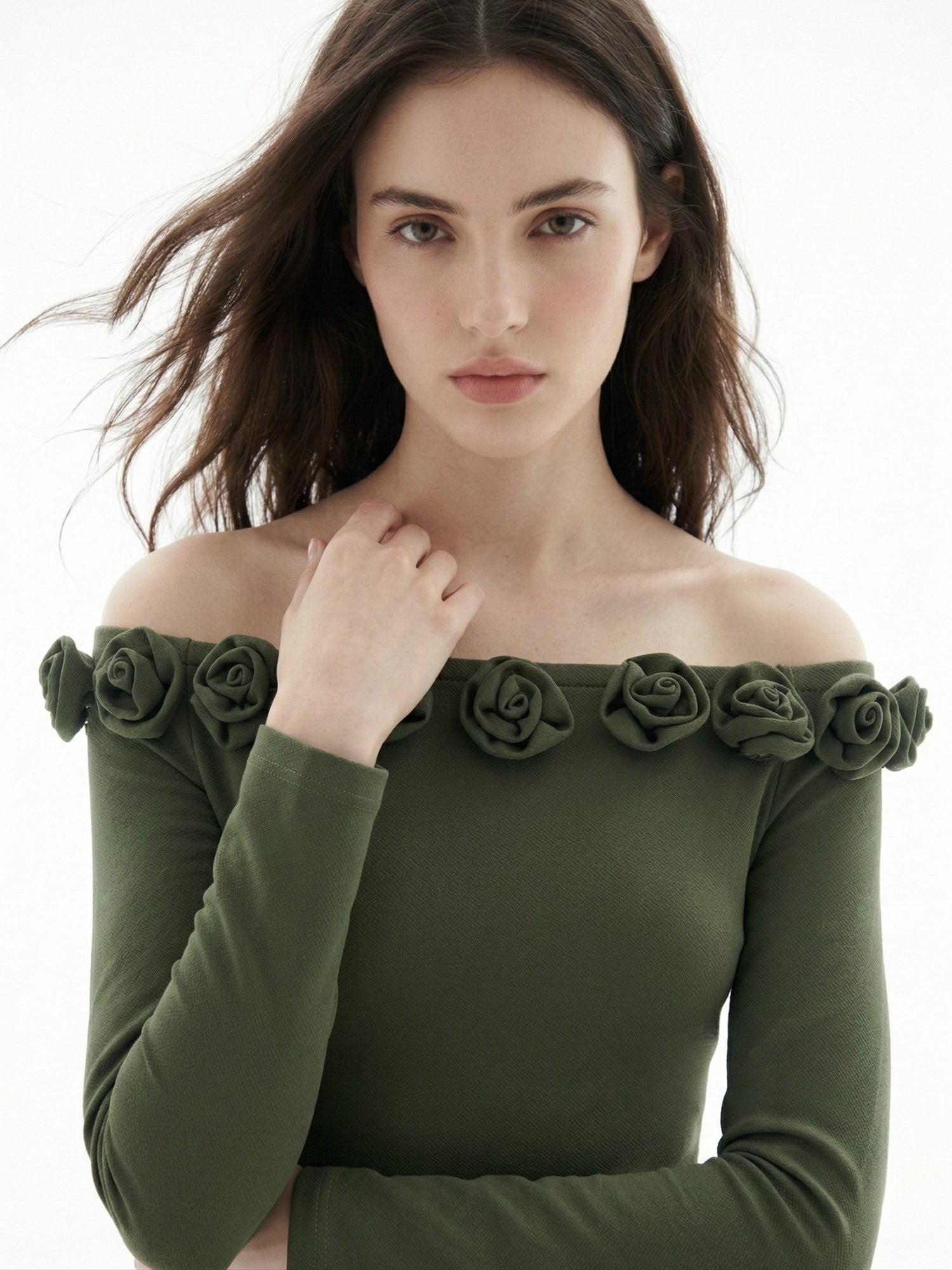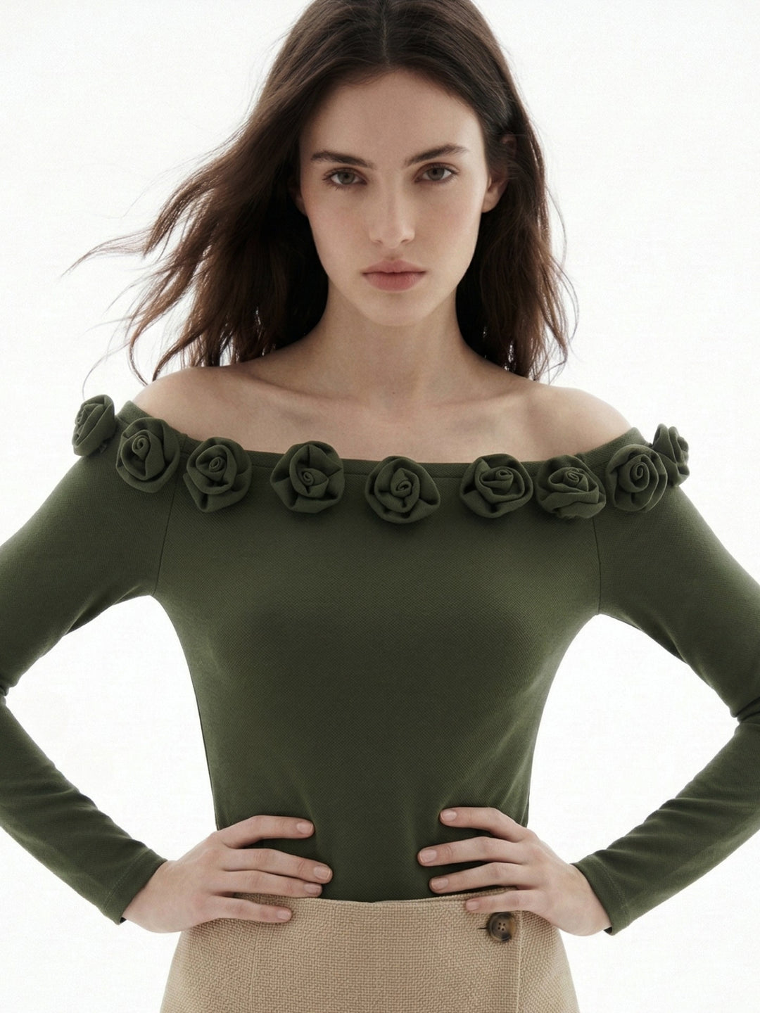 Olive Off-Shoulder Full Sleeved Top With Floral Embellishments