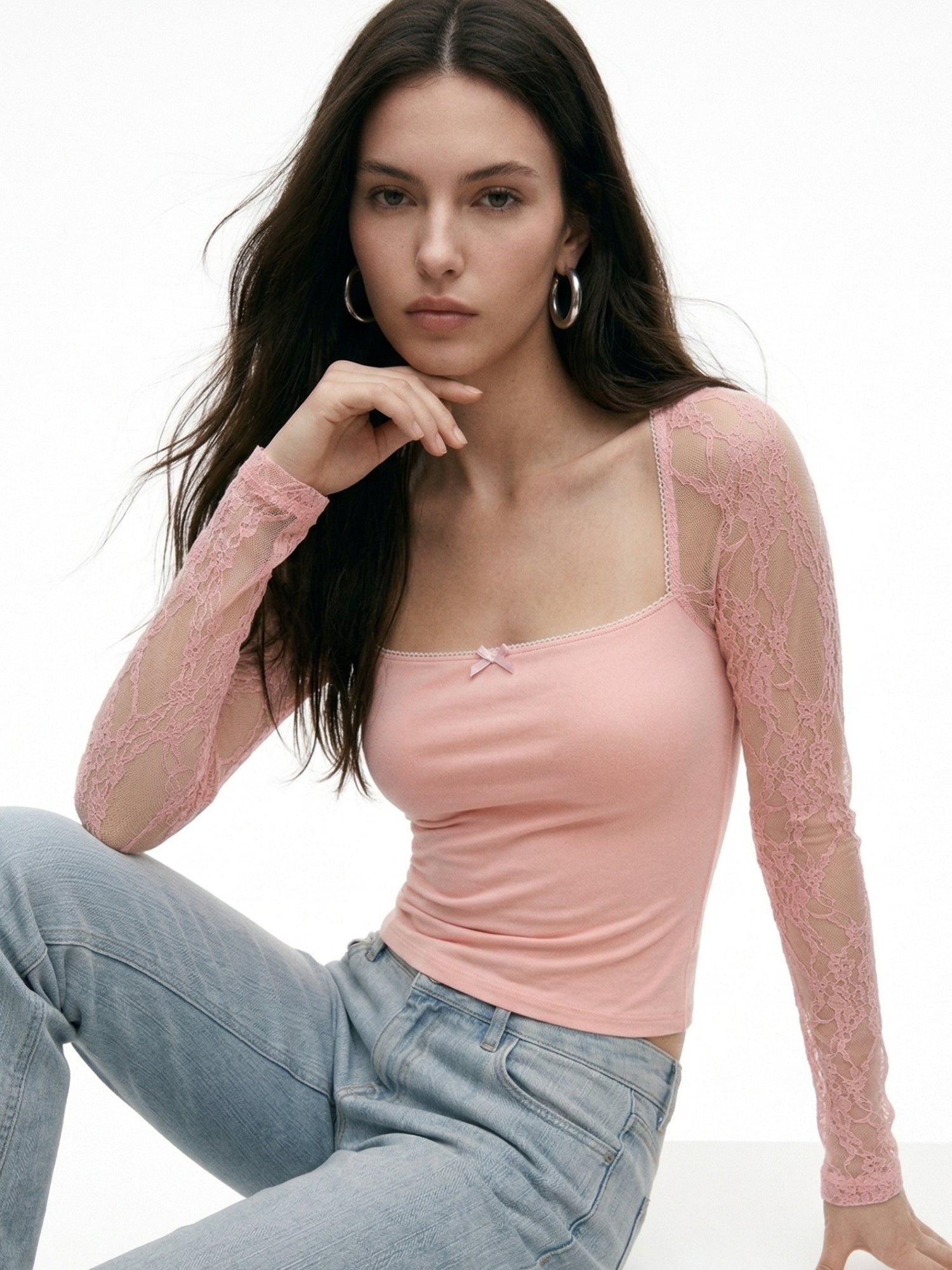 Pink Lace Sleeved Fitted Top