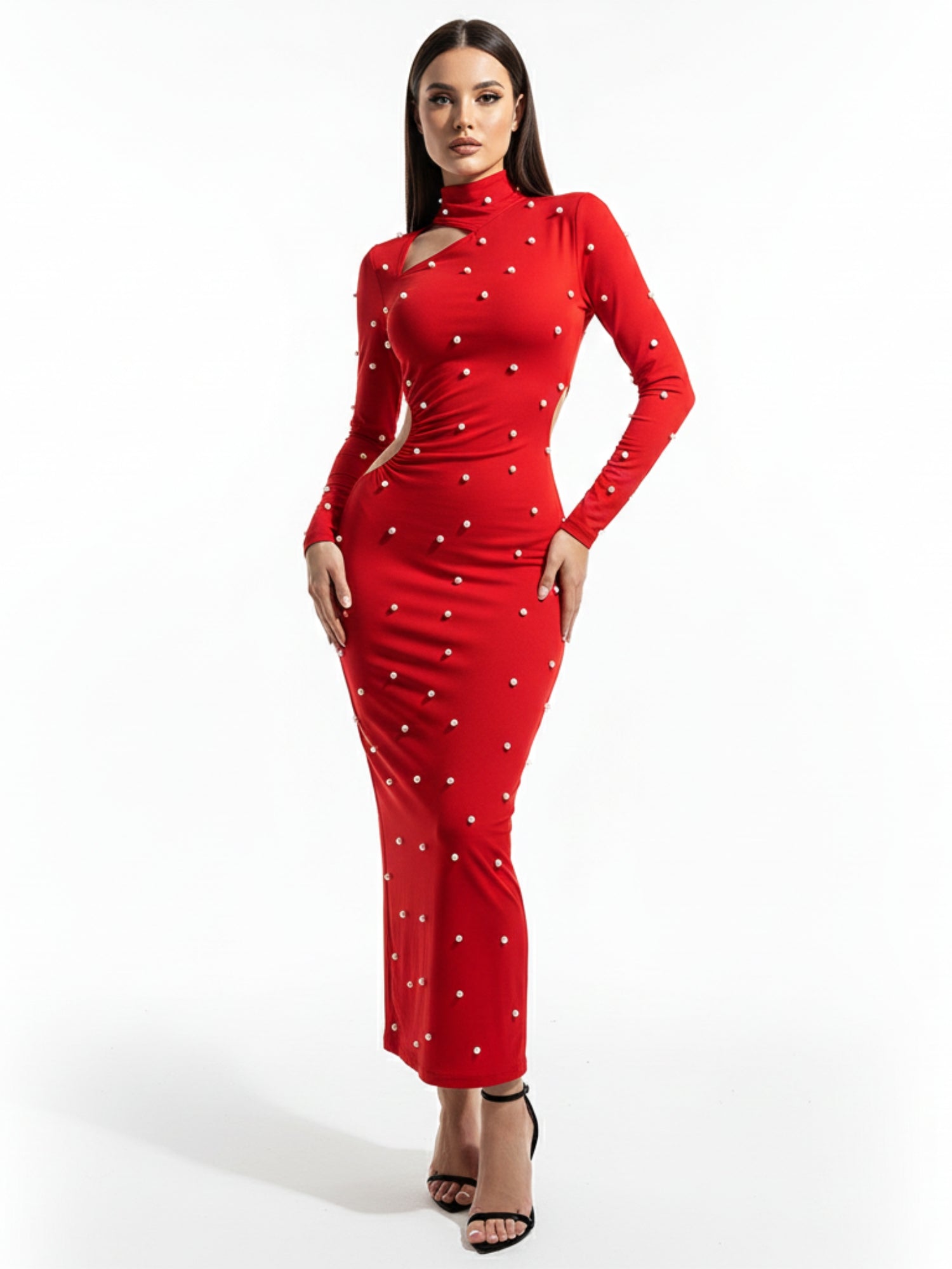 Red Full Sleeve Cut-Out Detail Mock Neck Dress