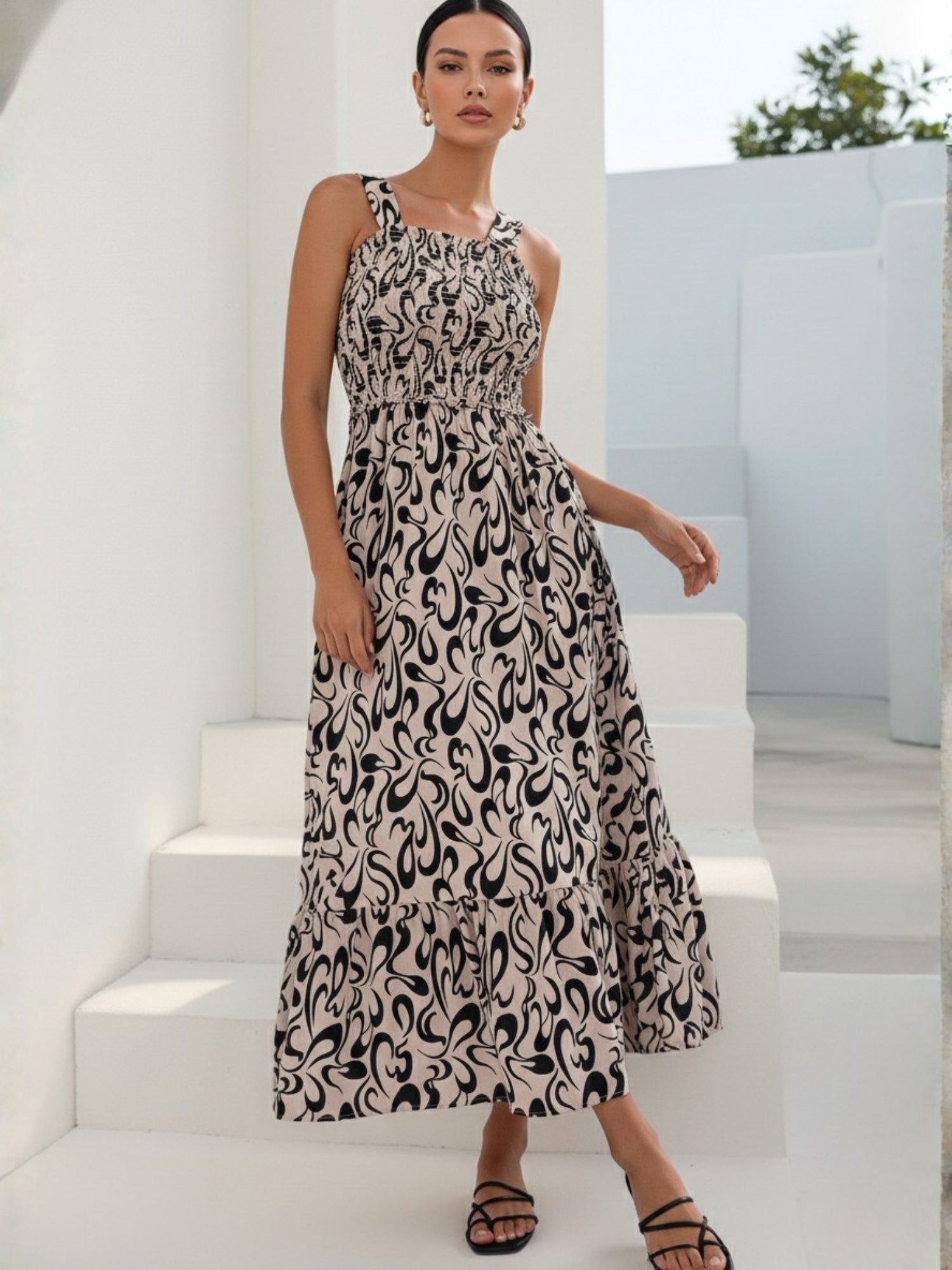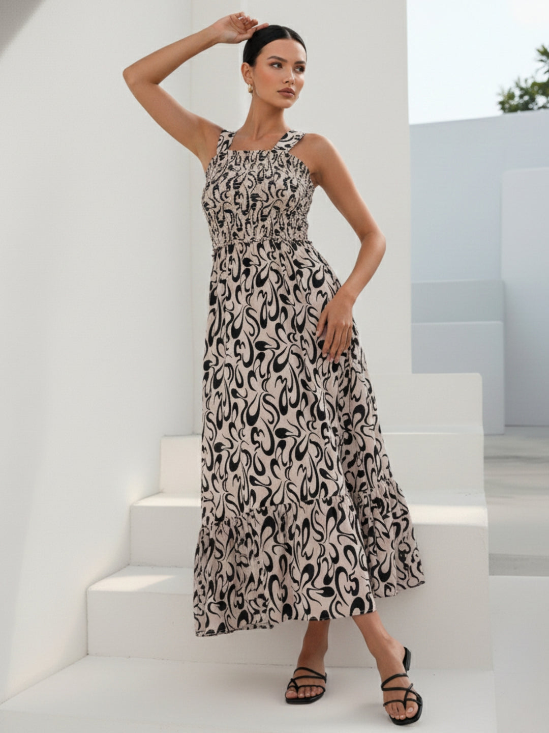 Make a vibrant statement in this multi-midi length printed dress featuring a playful flounce detail. The colorful pattern and breezy silhouette are perfect for tropical vacations or beach parties. A stunning patterned dress designed to ensure you look your best during resort outings and high-energy summer festivals.