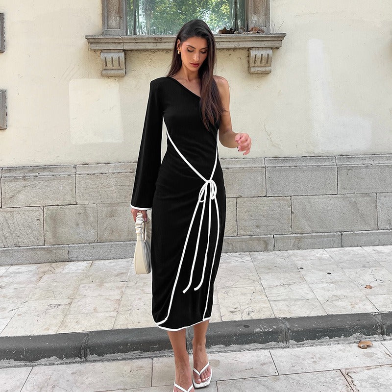 Black One Shoulder With One Full Sleeves Midi Dress