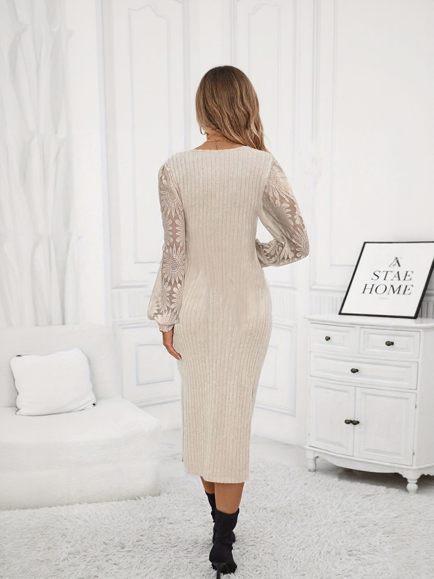 Turn heads in this stylish knitted bodycon dress featuring elegant lace sleeves. Perfect for any occasion, this midi dress offers a flattering fit and effortless charm. A must-have for your casual wear collection!
