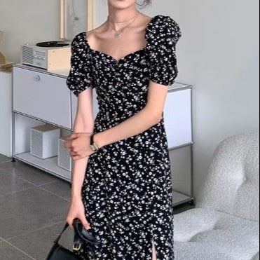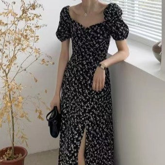 Black Dress With Smocking Slit And Puff Sleeves Detailing