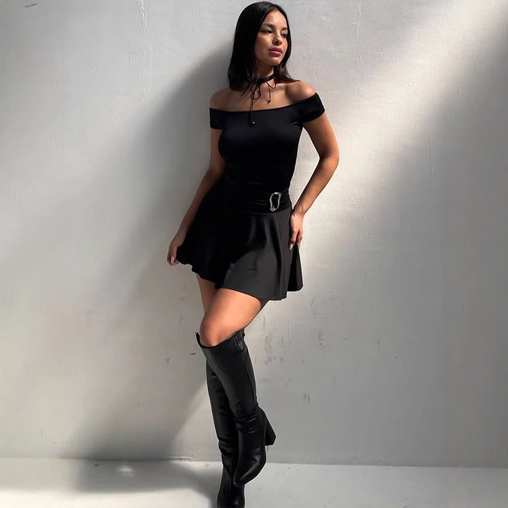Black Off-Shoulder Skater Solid Dress is the perfect mini dress for your going-out days. Featuring a flattering fit & flare fit, it shapes your silhouette and keeps you confident all day or night. Whether you're stepping out for a dinner or dancing the night away, this look is your go-to. Pair it with sneakers or heels, depending on your vibe. Add this black statement to your going-out wardrobe today.