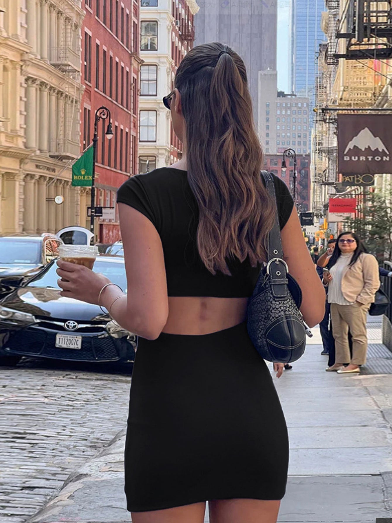 Black Short Sleeve Square Neck Dress fits your schedule. It’s a bodycon vacation mini dress made for vacation moments. Throw on a denim jacket or wear it solo,it works both ways. Its black tone blends into your wardrobe while still standing out. Easy to wear, easy to love.