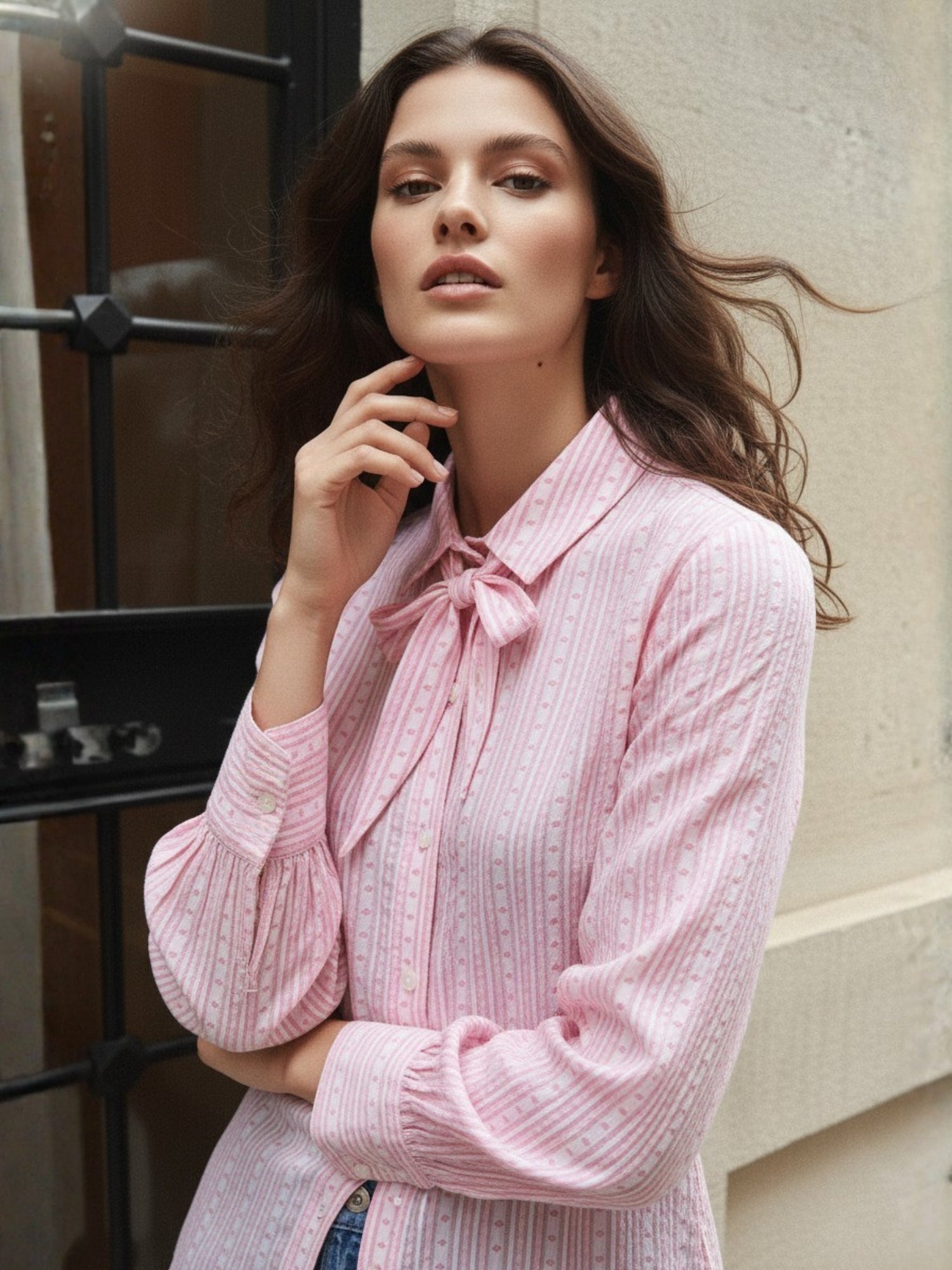 Pink Heart Dobby Tie Neck Shirt