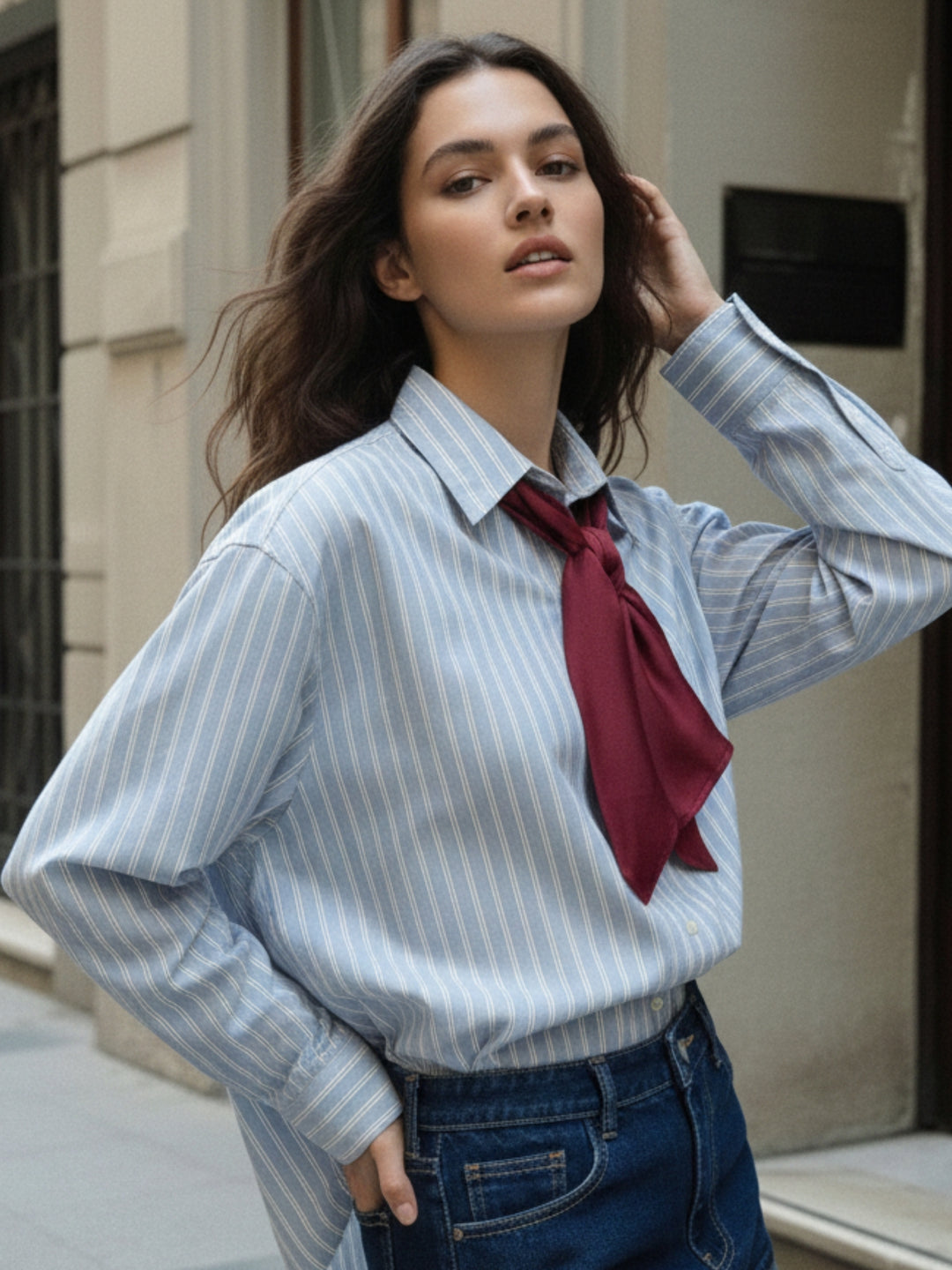 This blue long sleeve stripe shirt is a masterclass in classic style. A professional striped shirt for office wear, it features a crisp button-down design. Its versatile blue top aesthetic makes it equally suitable for business casual meetings or comfortable travel wear.