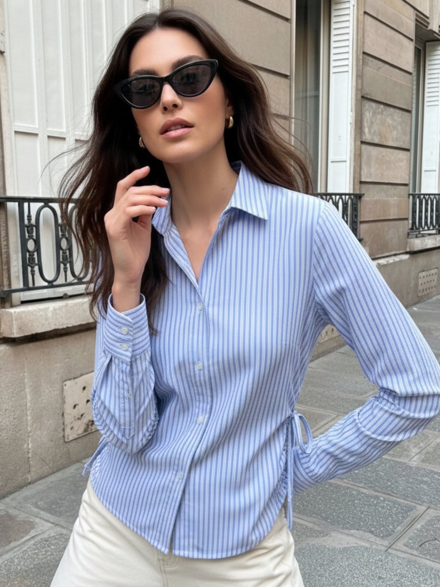 This blue side-tie fitted stripe top brings a nautical style to your summer wardrobe. The adjustable side tie ensures a perfect fit, making it an ideal choice for sailing trips or casual lunches. Pair this fitted striped shirt with white shorts for beachside dinners or weekend getaways.