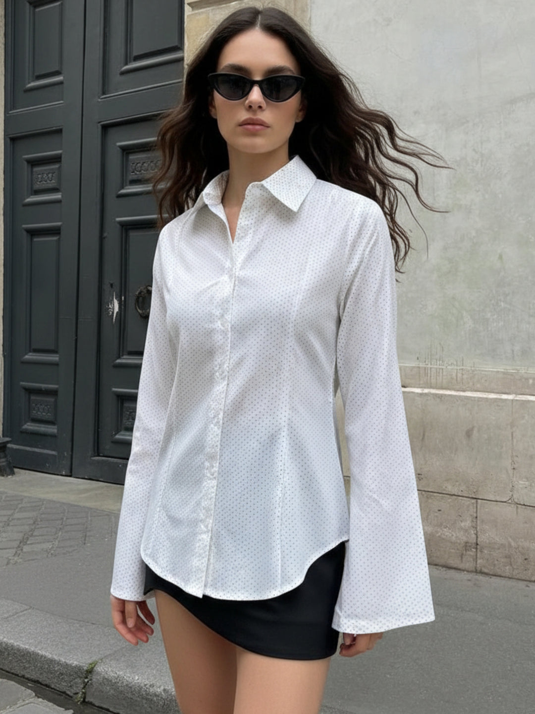 A wardrobe essential, this off-white fitted shirt offers a structured and minimalist top for any occasion. This crisp white shirt is perfect for business meetings or interviews. Its classic white blouse design also works well for a casual office look when paired with denim.