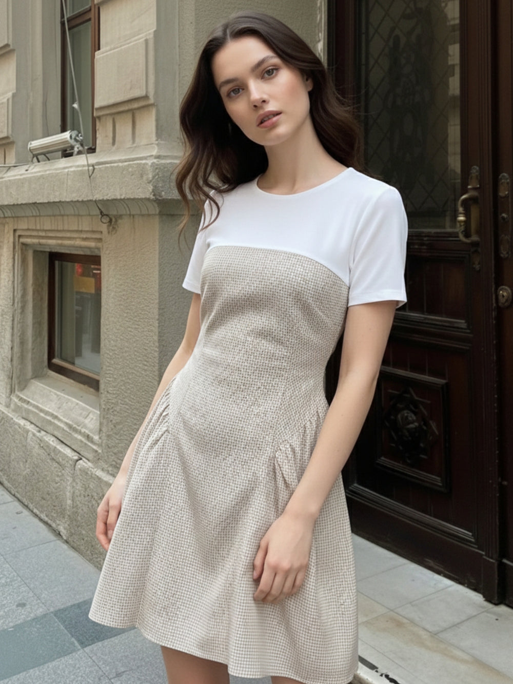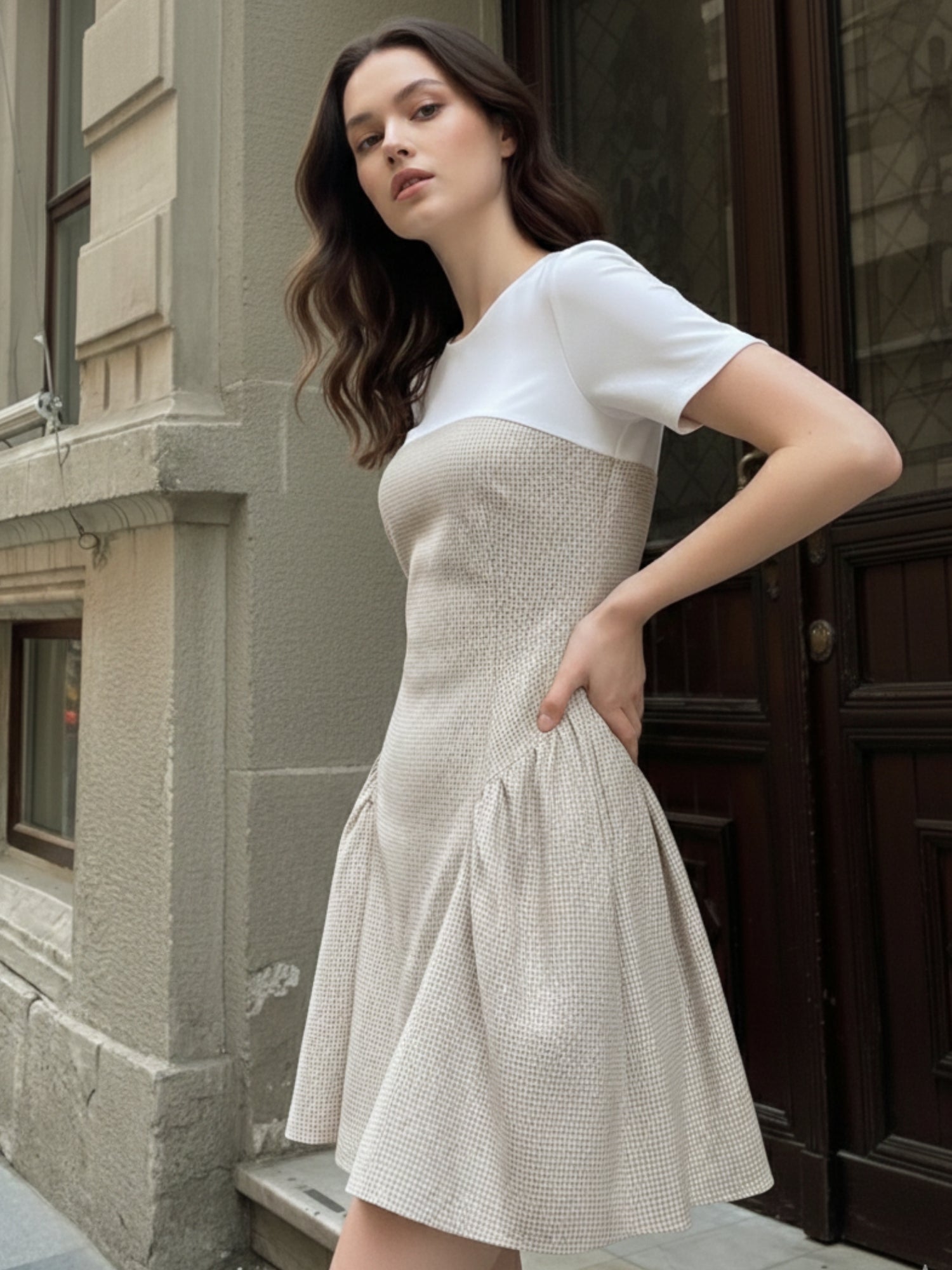 Multi Mini check dress with flared skirt.