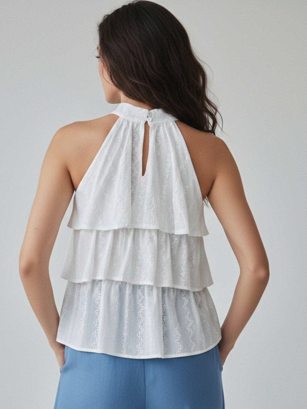 This white halter-neck tiered top offers a breezy and playful silhouette that is perfect for summer festivals. The tiered design adds movement and a touch of boho-chic to your look. Ideal for garden parties or casual brunches, style it with light-wash denim and layered necklaces for an effortless and stylish daytime ensemble.