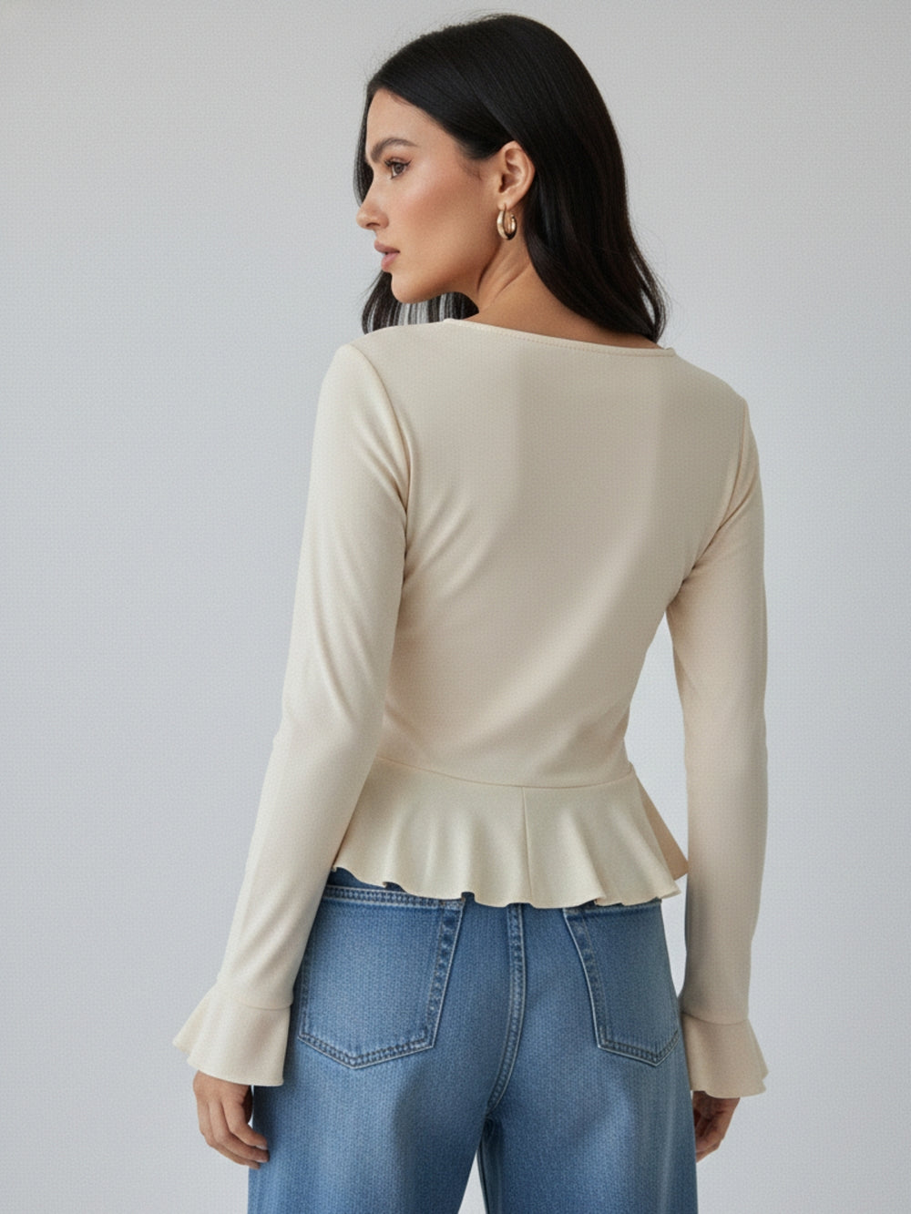 Embrace soft elegance in this off-white ruffle-detail top, featuring charming bell sleeves for a touch of flair. The delicate design and soft neutral tone make it ideal for garden parties or a sunny summer brunch. Style it with pastel trousers for a soft, sophisticated daytime ensemble that easily transitions into a casual office setting.