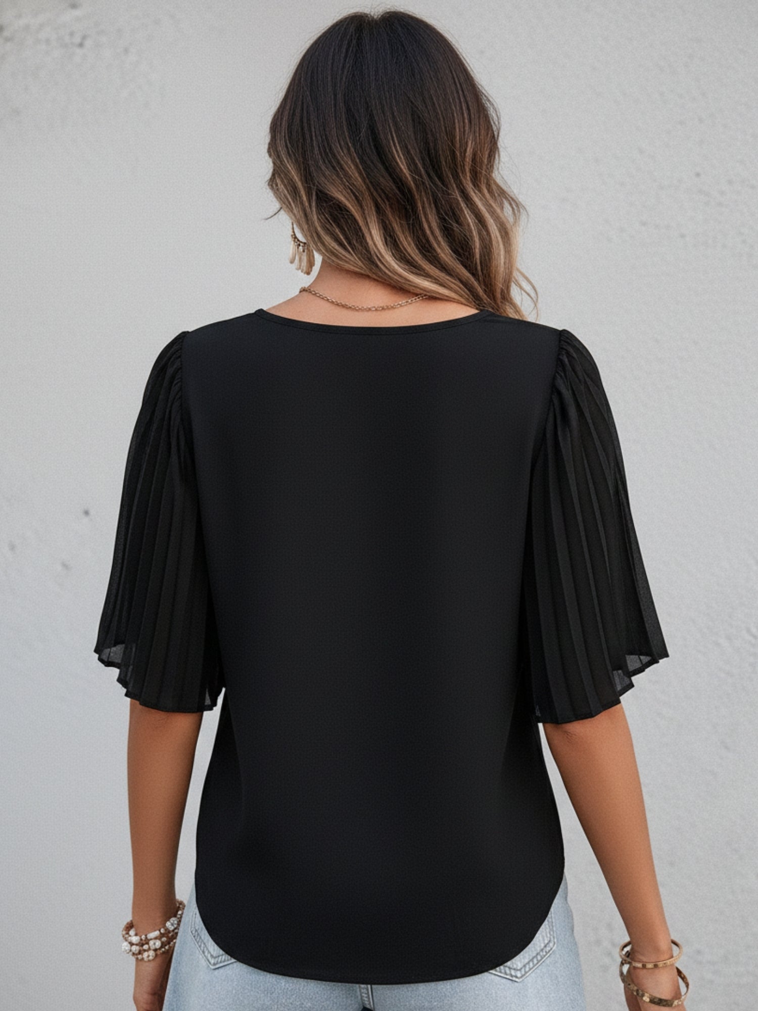 Exude timeless sophistication in this black v-neck top, featuring dramatic flared sleeves for a touch of flair. The elegant silhouette and classic black hue make it ideal for office events or formal dinners. Pair it with tailored trousers and classic pumps for a polished, professional look that easily transitions into an evening social.