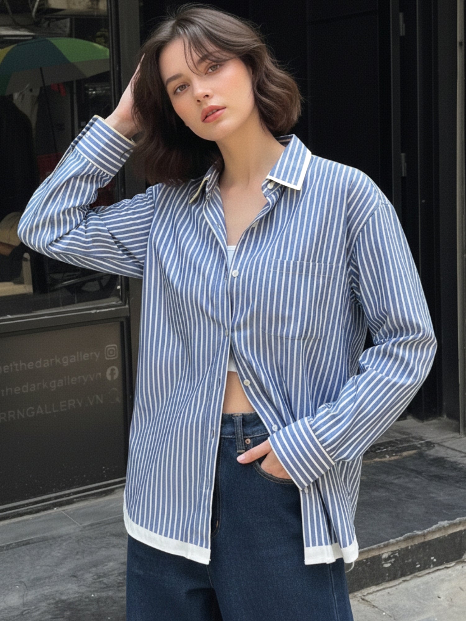 Achieve an effortless aesthetic with this blue oversized stripe shirt. This boyfriend style shirt is a trendy striped blouse for streetwear looks or comfortable travel days. The relaxed blue top design also works perfectly for a casual office environment or simply lounging at home.