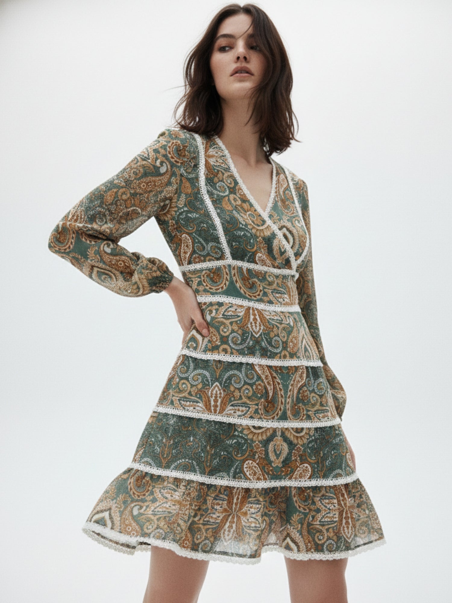 Stand out in this vibrant green lace trim mini dress featuring romantic puff sleeves. The refreshing green hue and botanical feel are perfect for garden parties and summer brunches. As an outdoor wedding guest or for vacation outings, style it with woven accessories and flat sandals to achieve a breezy and elegant summer look.