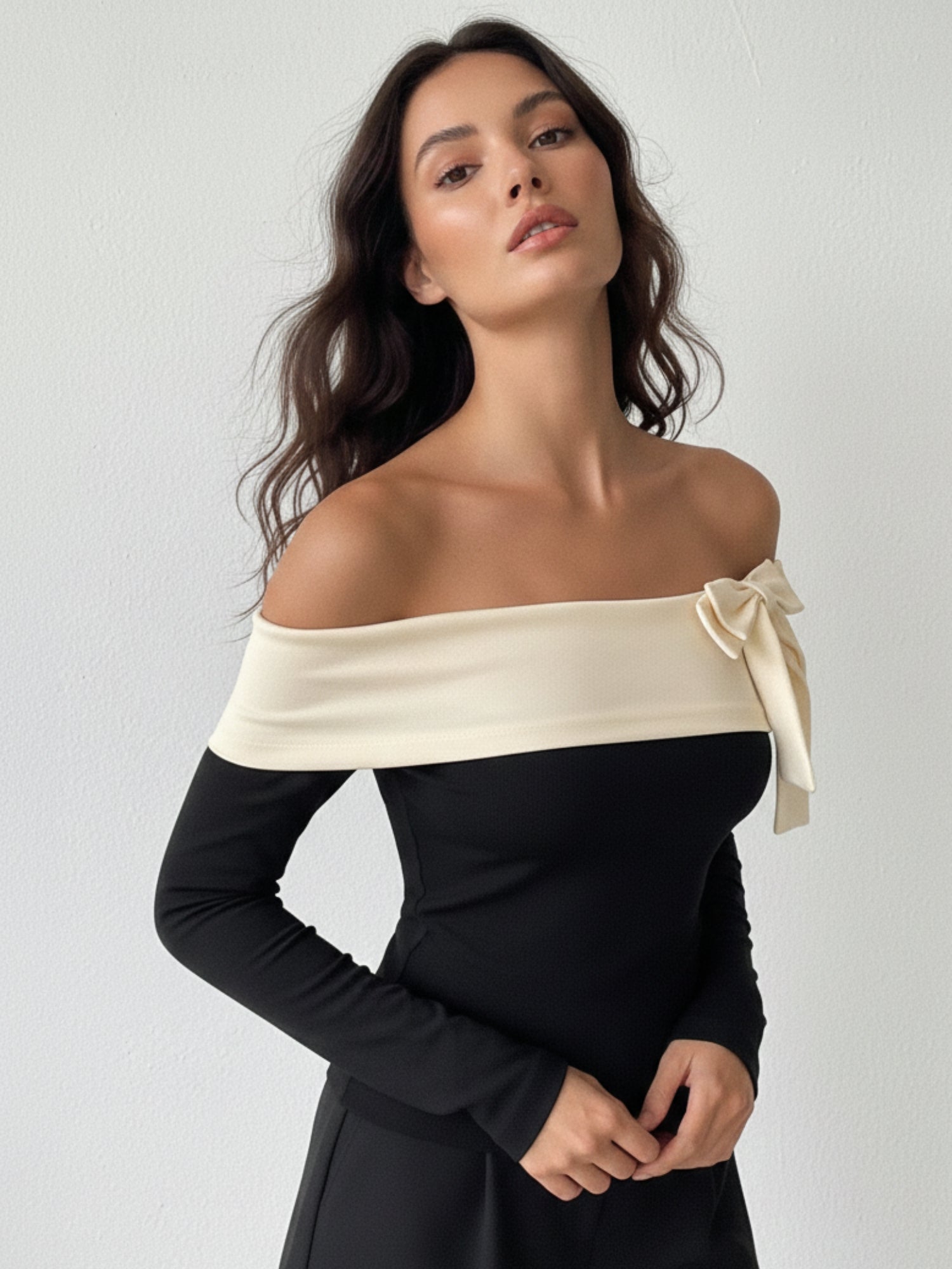 Show off your shoulders in this chic black off-shoulder top, highlighted by a charming bow detail. The feminine neckline and elegant design make it a perfect choice for date nights or cocktail hour. Combine it with high-waisted denim or a sleek skirt for an effortless evening ensemble that is both trendy and sophisticated.