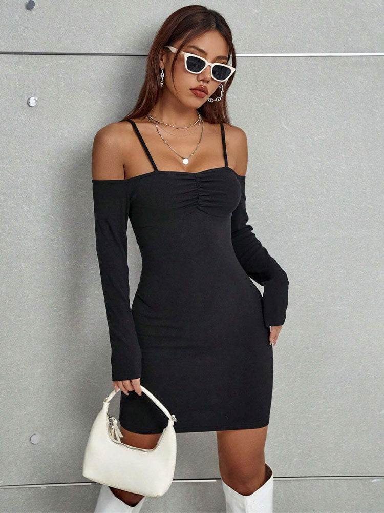 Black Off Shoulder Full Sleeves Mini Dress With Straps On Shoulder fits your schedule. It’s a slim party mini dress made for party plans. Throw on a denim jacket or wear it solo,it works both ways. Its black tone blends into your wardrobe while still standing out. Easy to wear, easy to love.