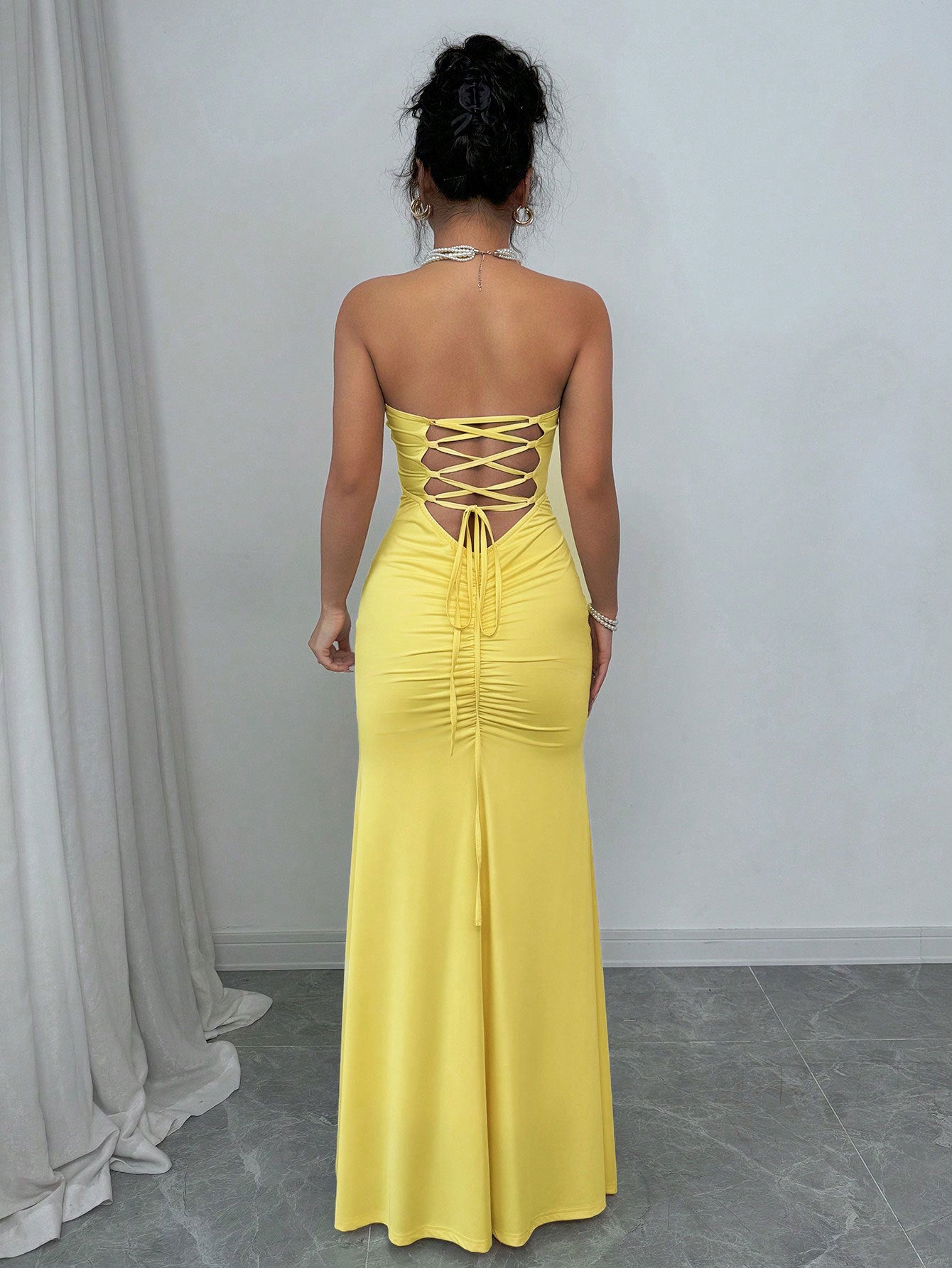Yellow Strapless Back Criss Cross Tie-Up Dress
