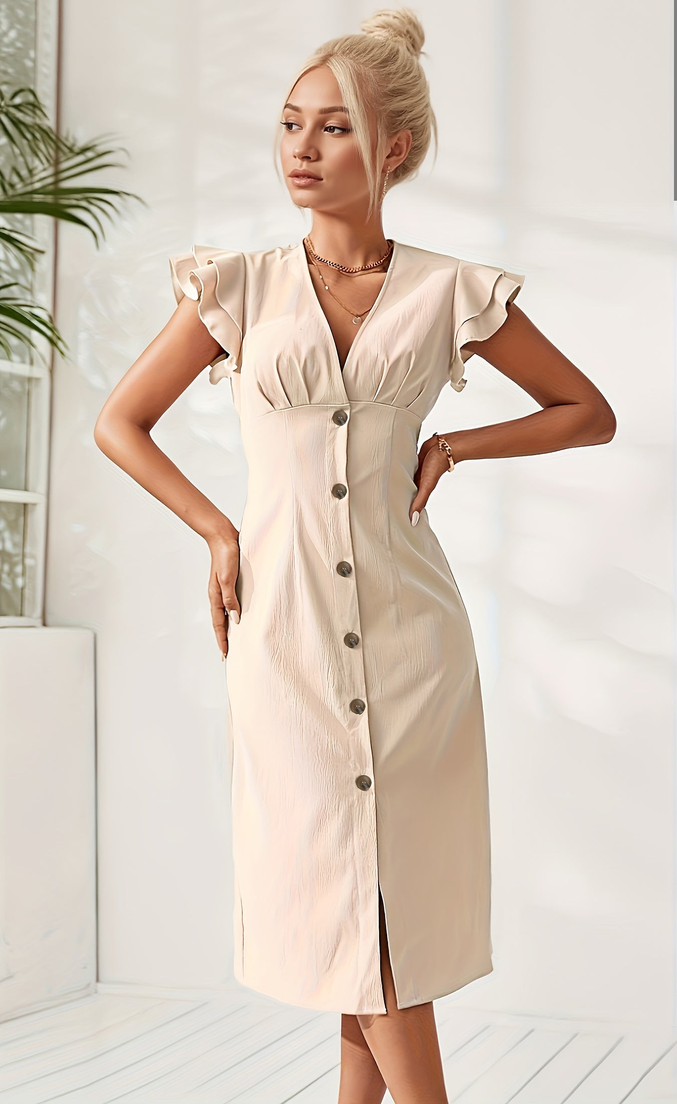 Perfect for casual outings, the Butterfly Sleeves Button Down Dress combines comfort and style. Featuring a flattering midi length and button-down design, this dress is ideal for everyday wear. Its butterfly sleeves add a unique flair, making it a versatile piece for any women's wardrobe.