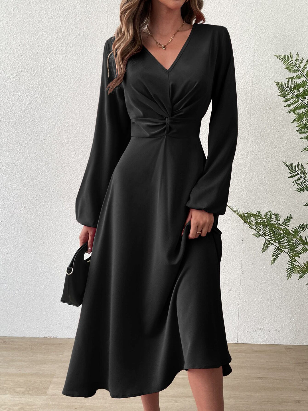 Black Bishop Sleeve V Neck Dress