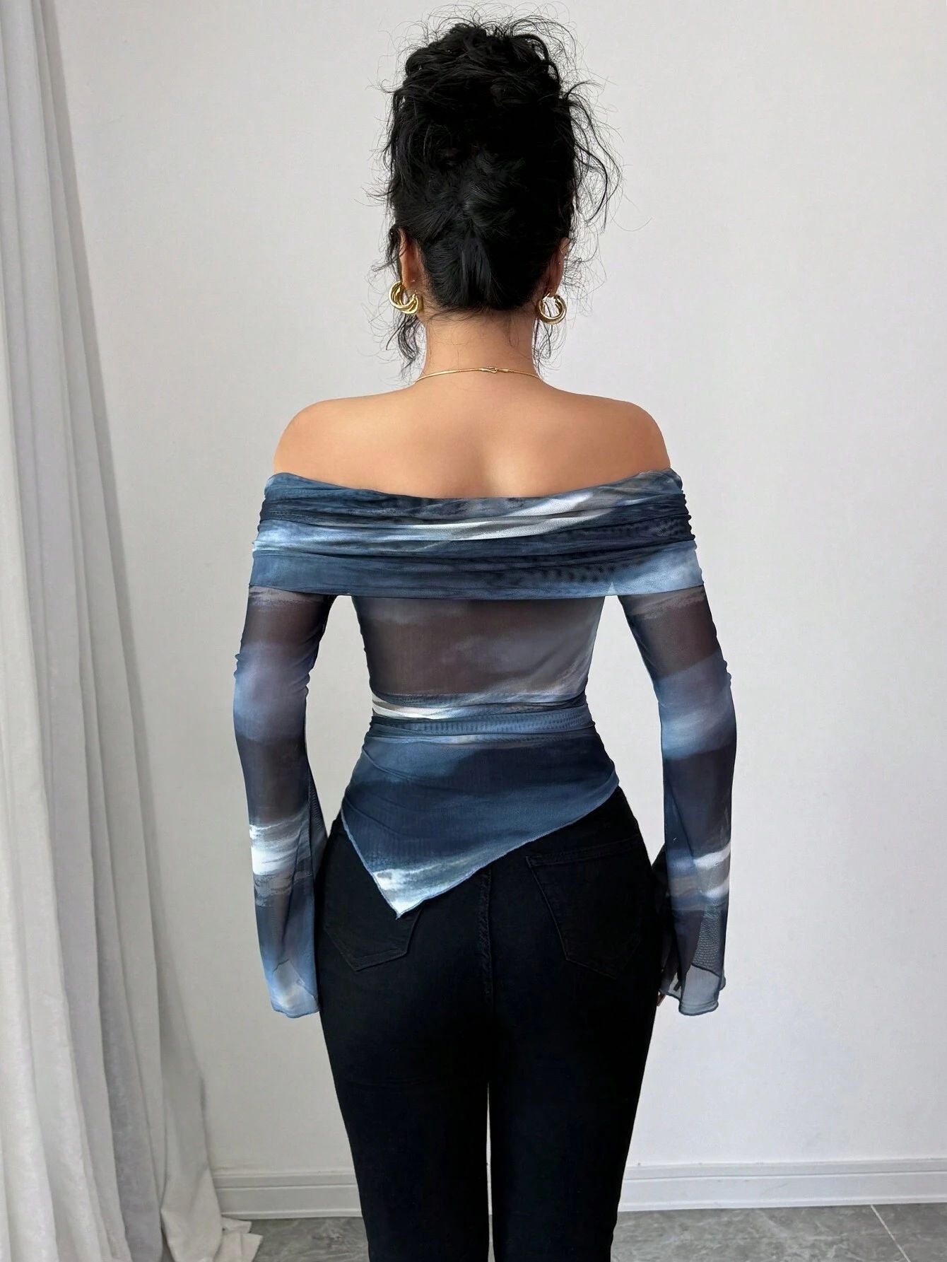 Blue Bell Sleeve Off Shoulder Asymmetrical Top