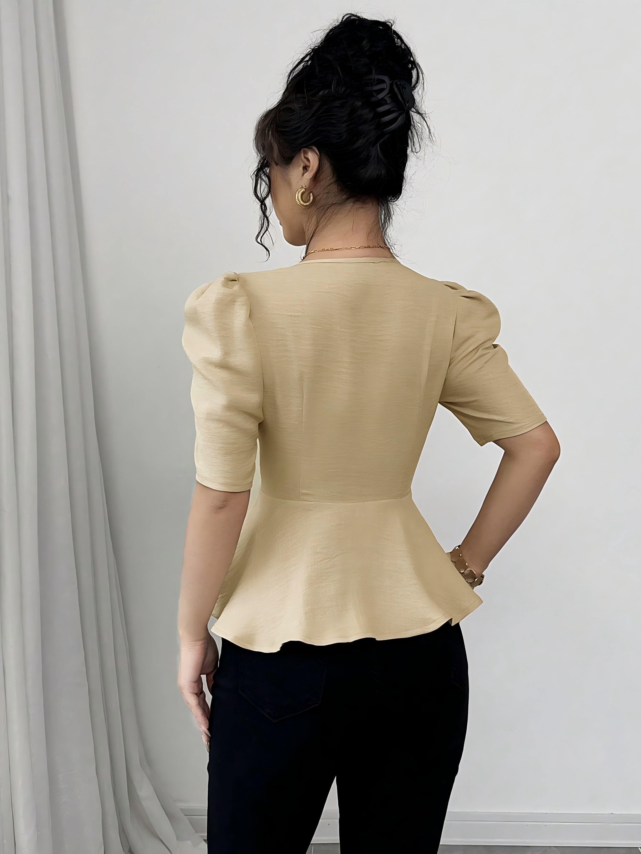 Beige Puff Sleeve Square Neck Peplum Style Top