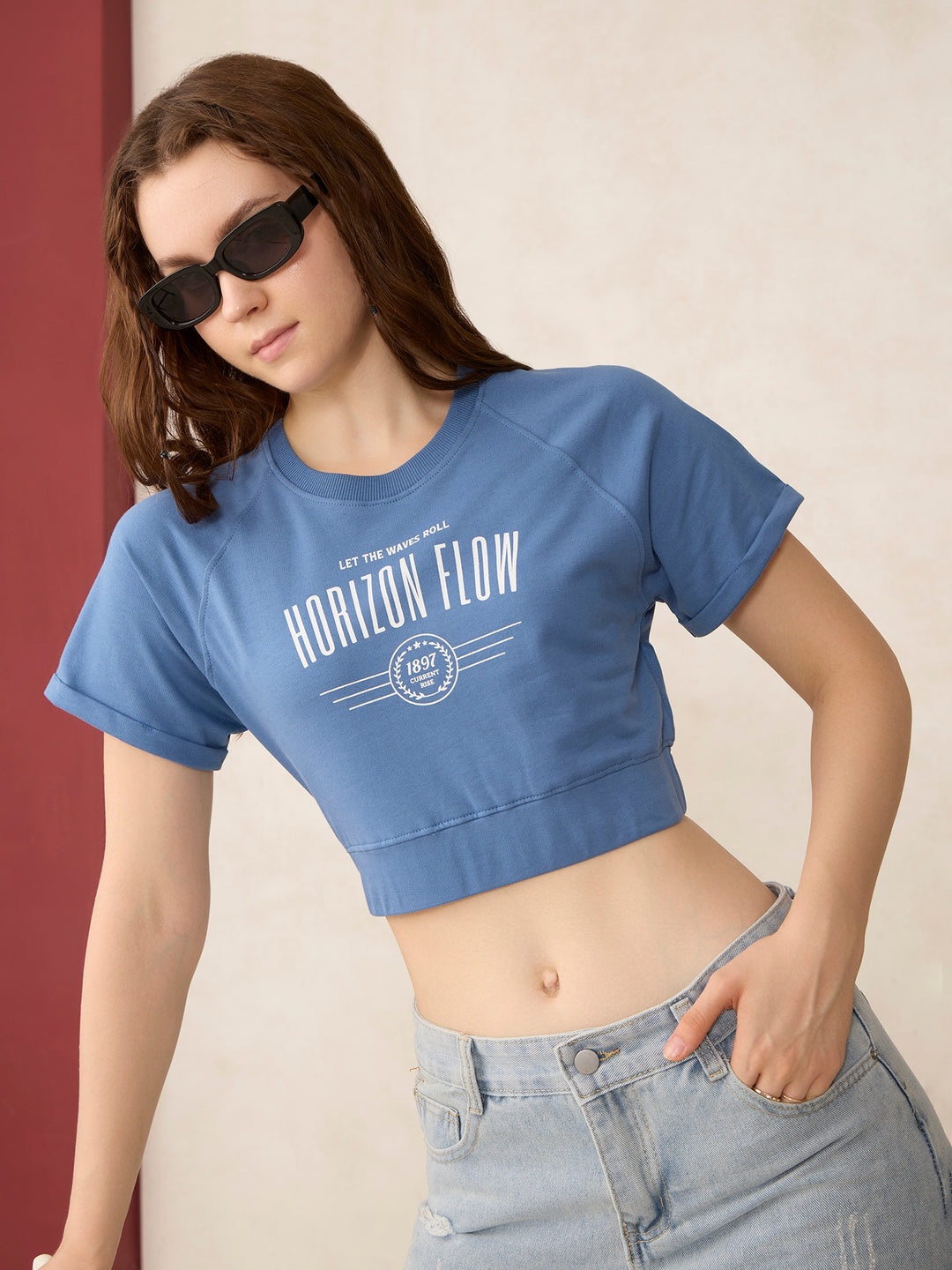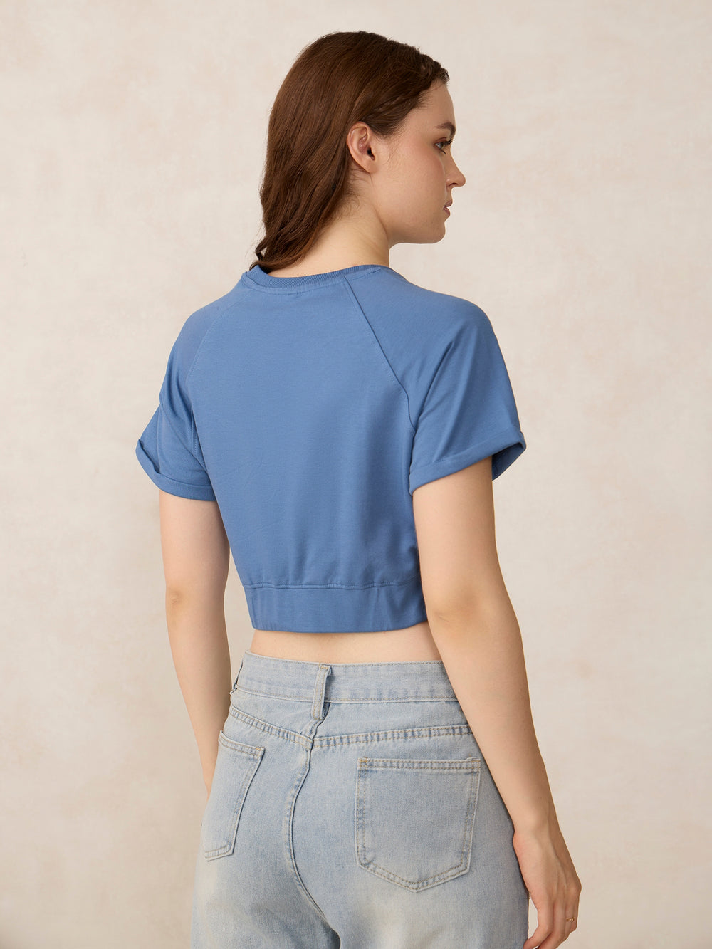 The Blue Cropped Raglan Sleeve Sweatshirt isn’t just a casual wear, it's your fashion fallback. Blue brightens up your closet, and the cropped cut means it pairs with almost everything.