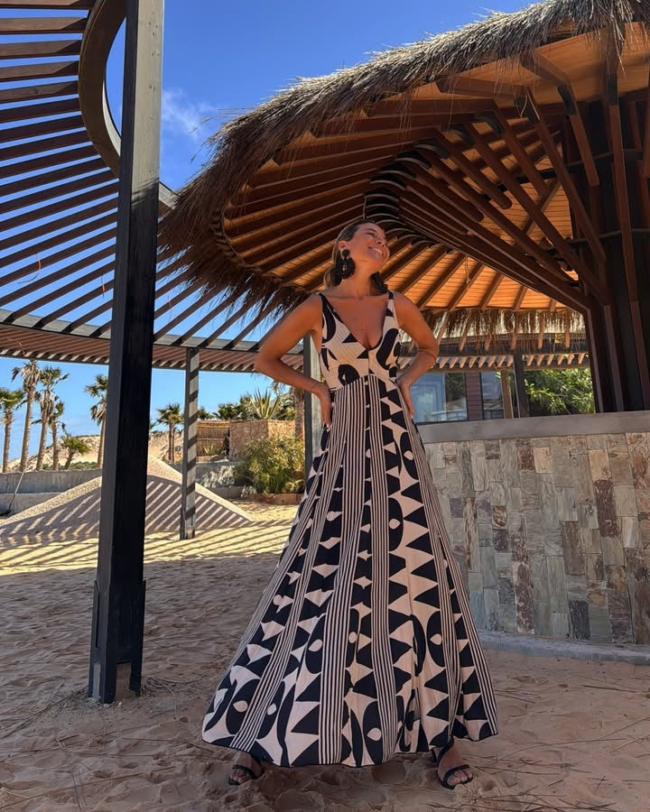 Navy Blue Abstract Print Sleeveless Plunging Neck Dress