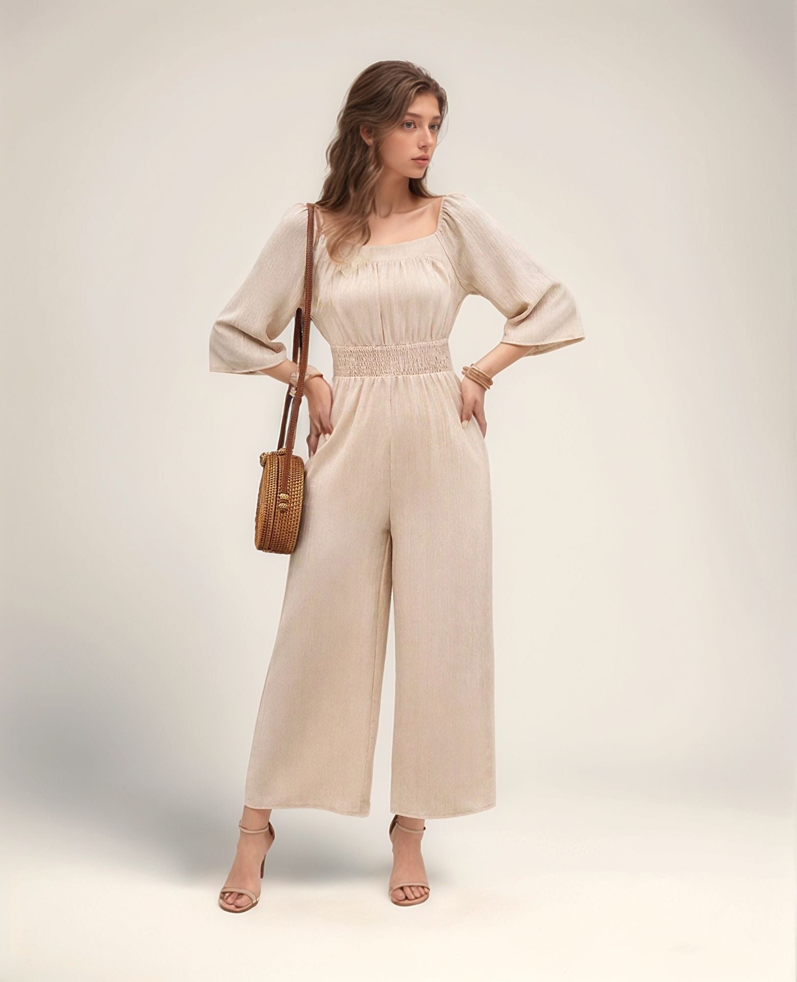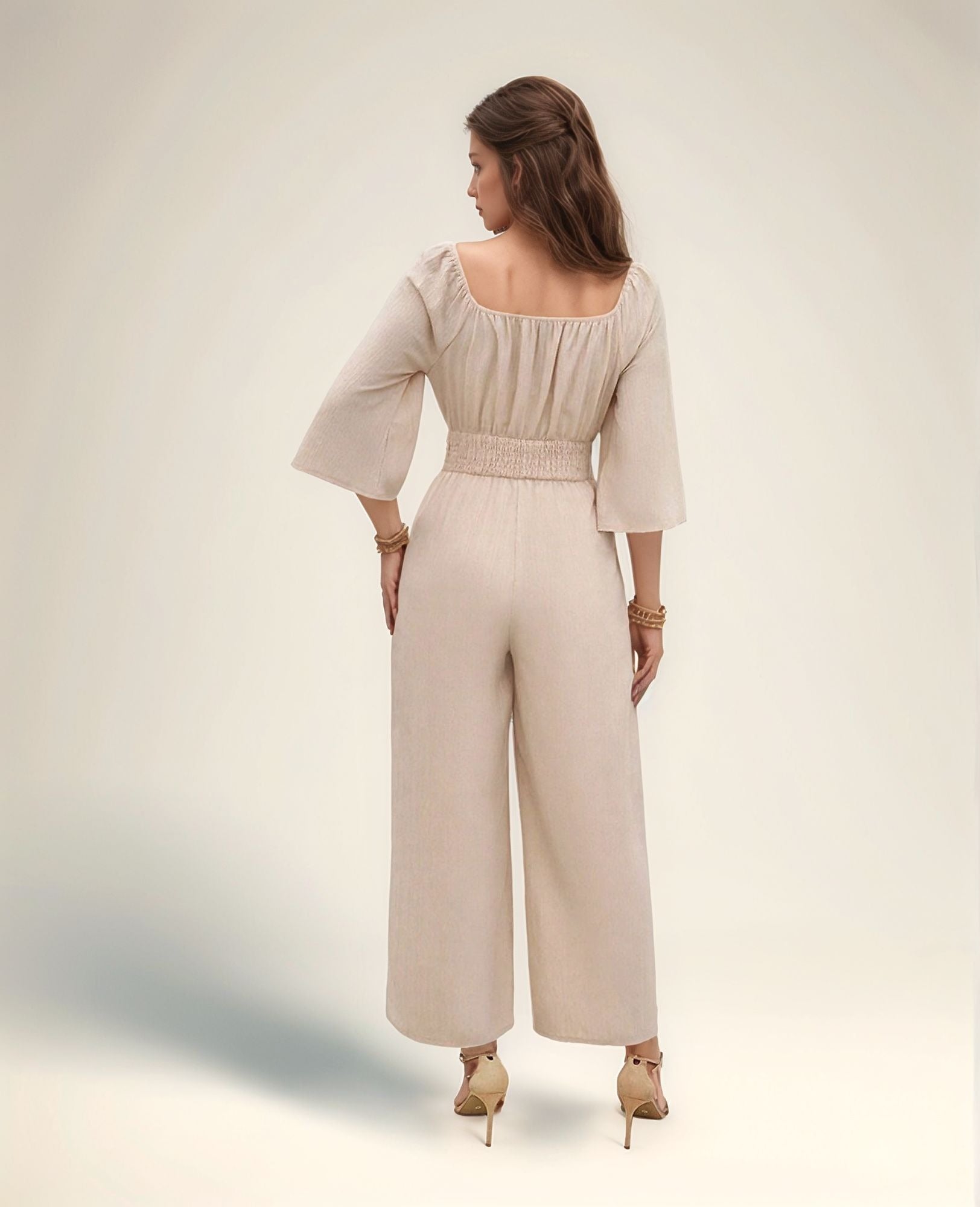 Cream Wide Leg Jumpsuit With Smocking Detail