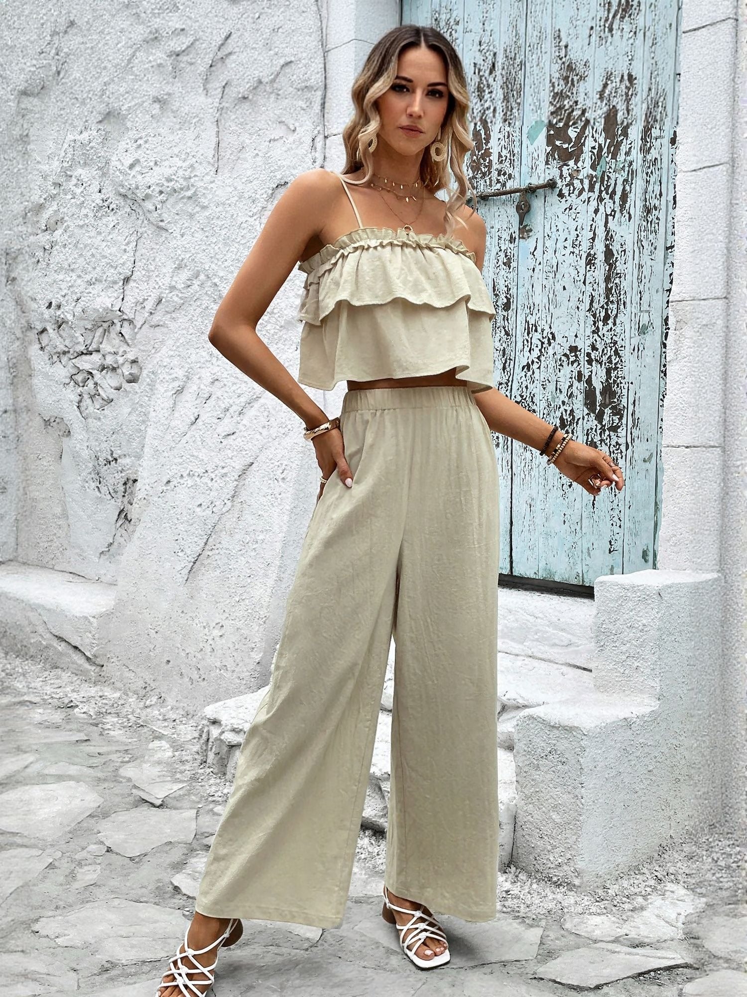 Beige Tiered Strappy Top With Straight Fit Trouser Co-Ord Set