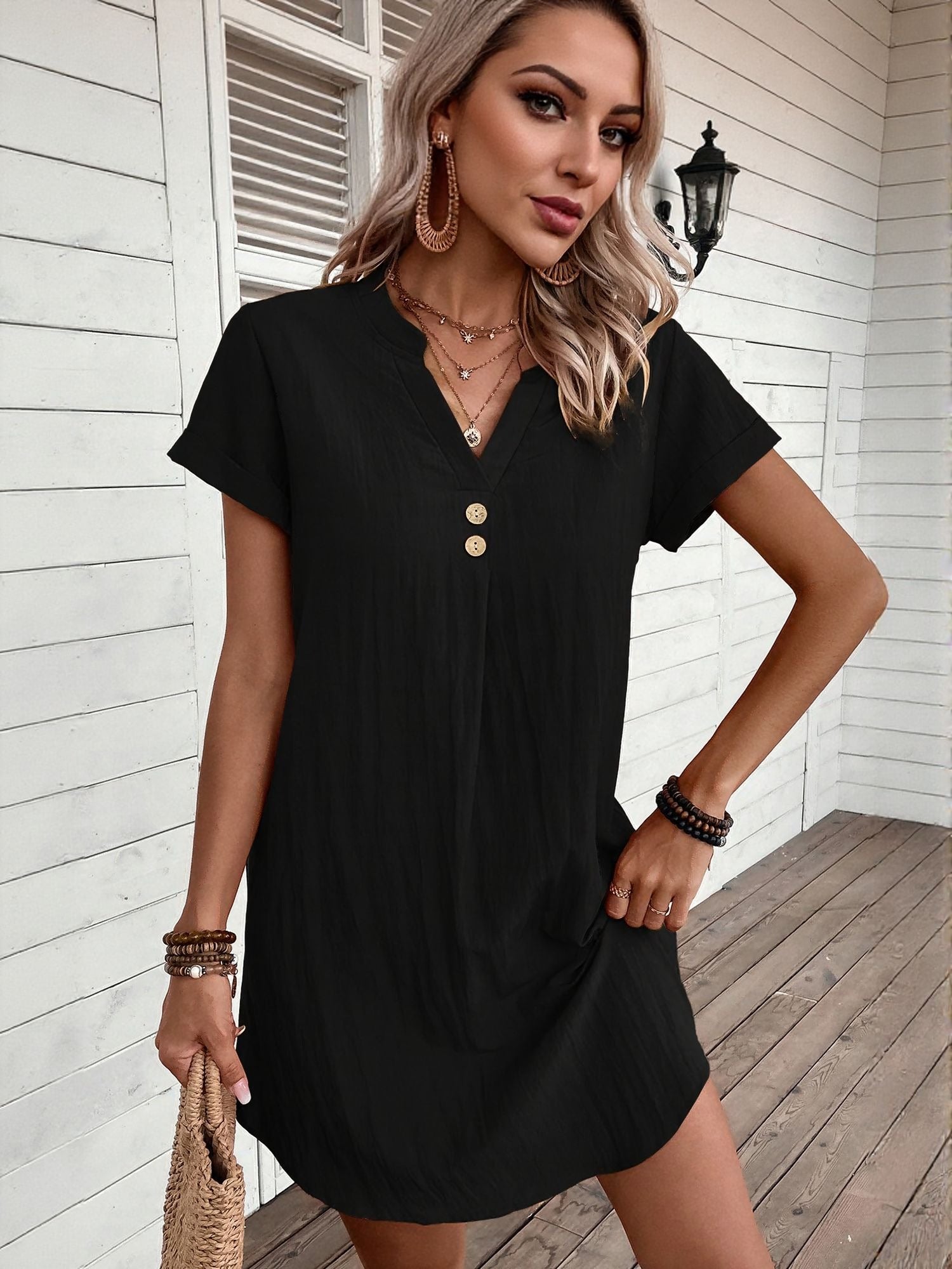 Step into the scene with Black Short Sleeve Shift Dress, a must-have mini dress designed for going-out days. The relaxed silhouette hugs the body for a sleek and defined look. Comfortable yet elevated, it’s ideal for evening events, birthday plans, or your next city outing. Add some glam with accessories or keep it simple,it works either way. A perfect black addition to your occasion-ready wardrobe.