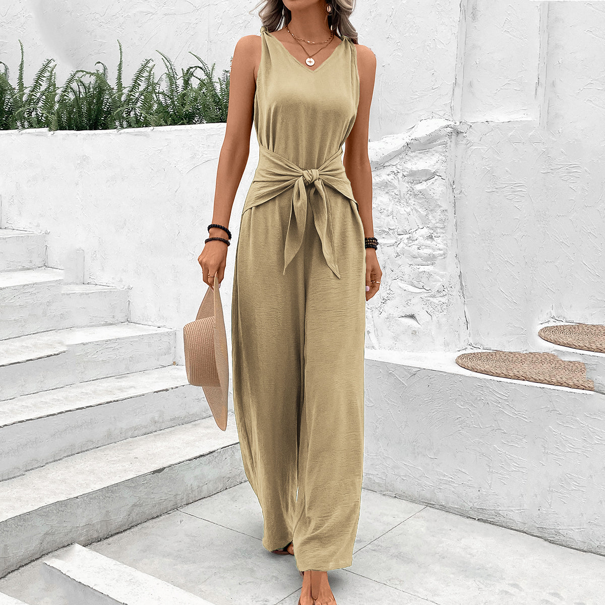 Beige Sleeveless Jumpsuit With Front Tie Up