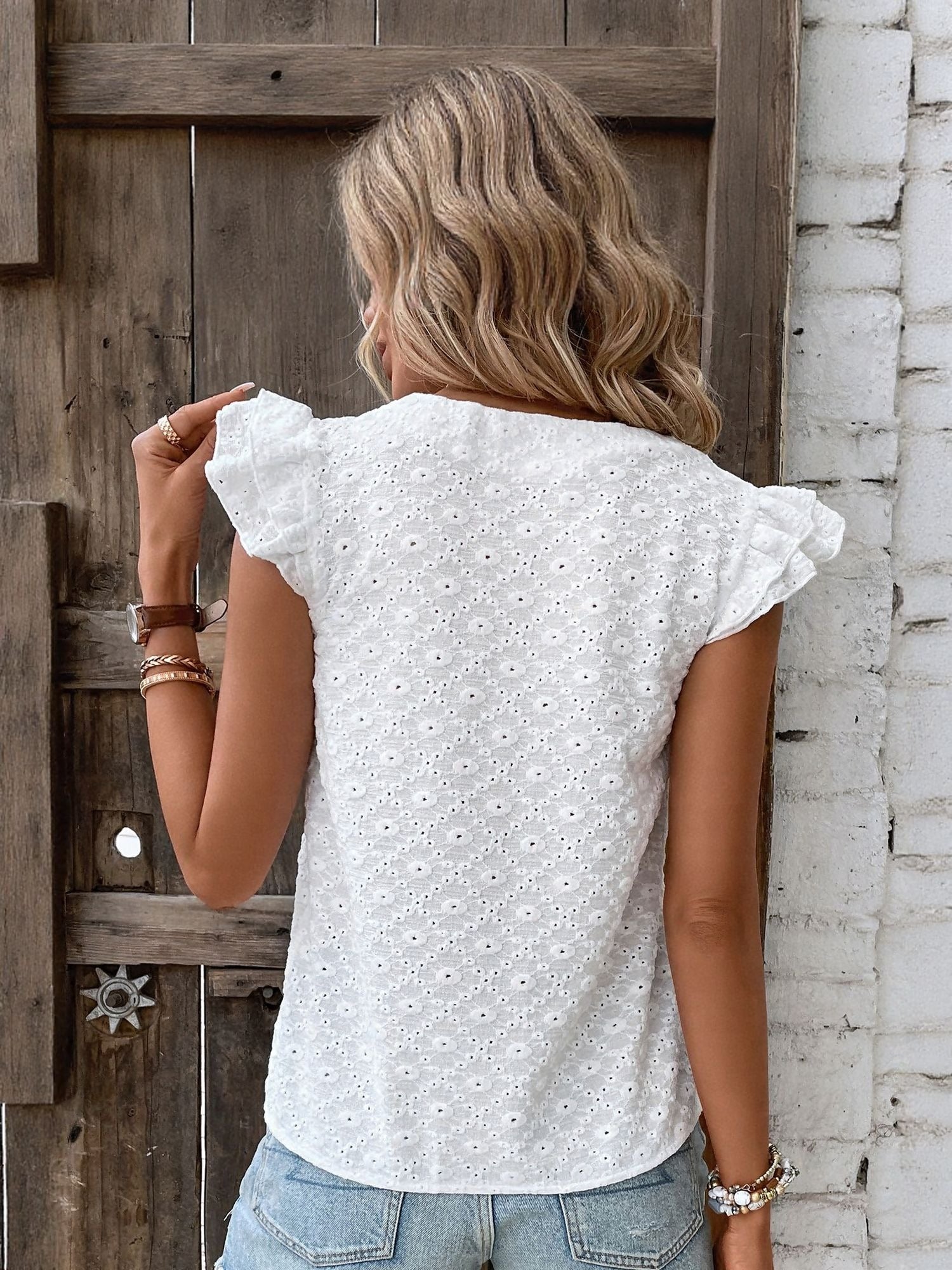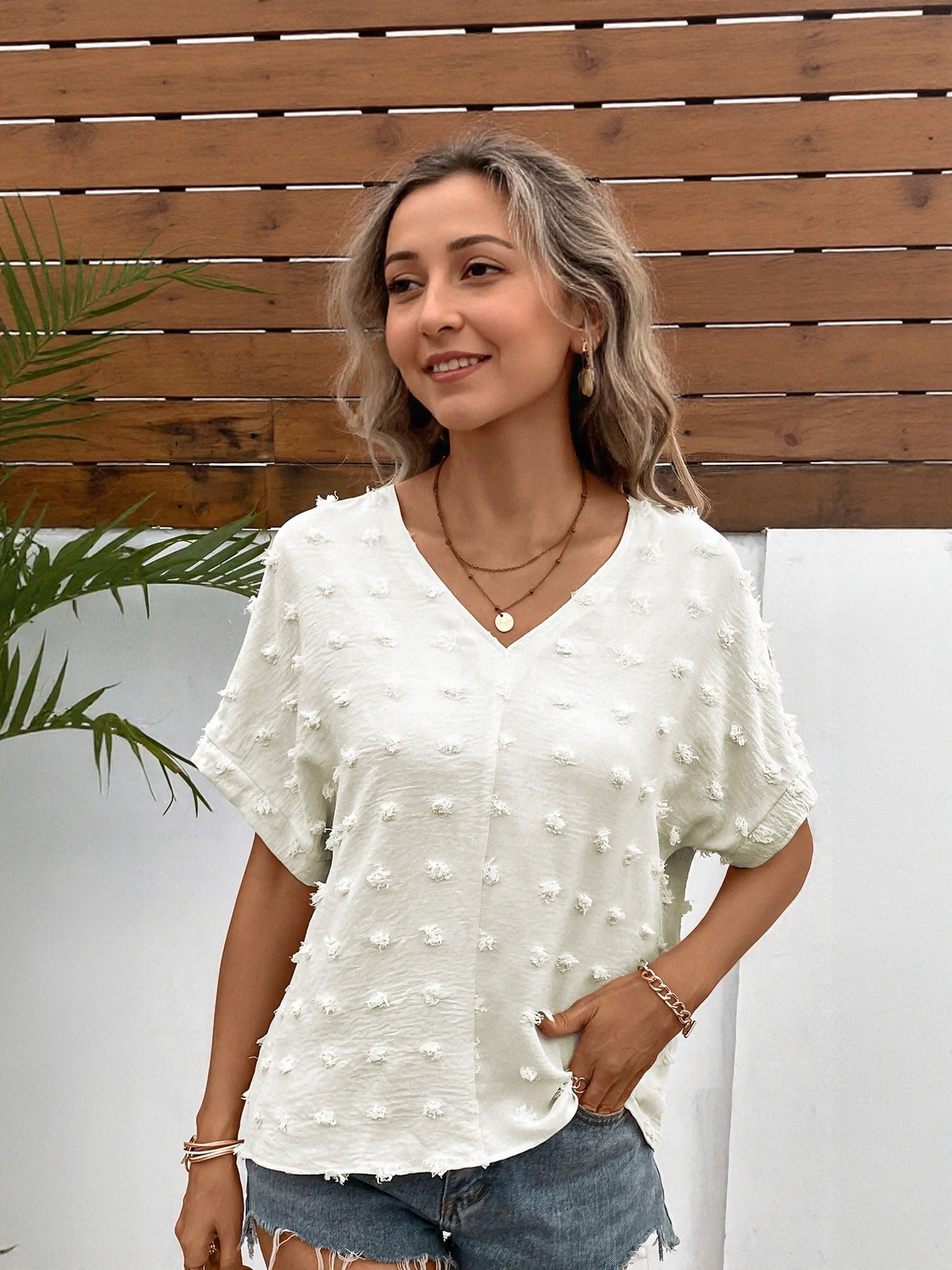 White V Neck Blouse With Dobby Texture