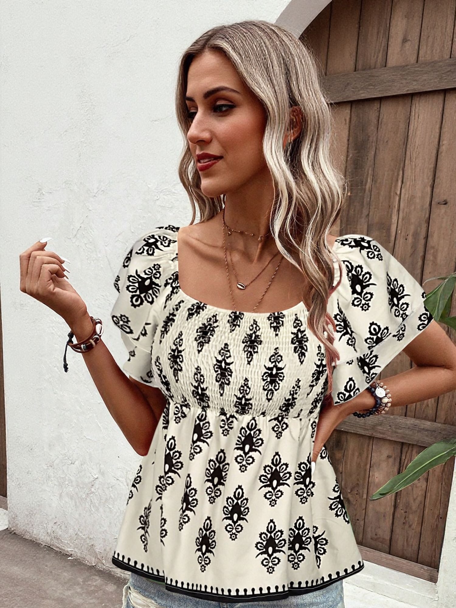 The Off White Top With Flared Sleeve And Smocking Detail is what your outfit plans have been waiting for. Finished in white, this vacay wear plays well with both your everyday denim and late-night layers. Designed to be fuss-free and flattering.