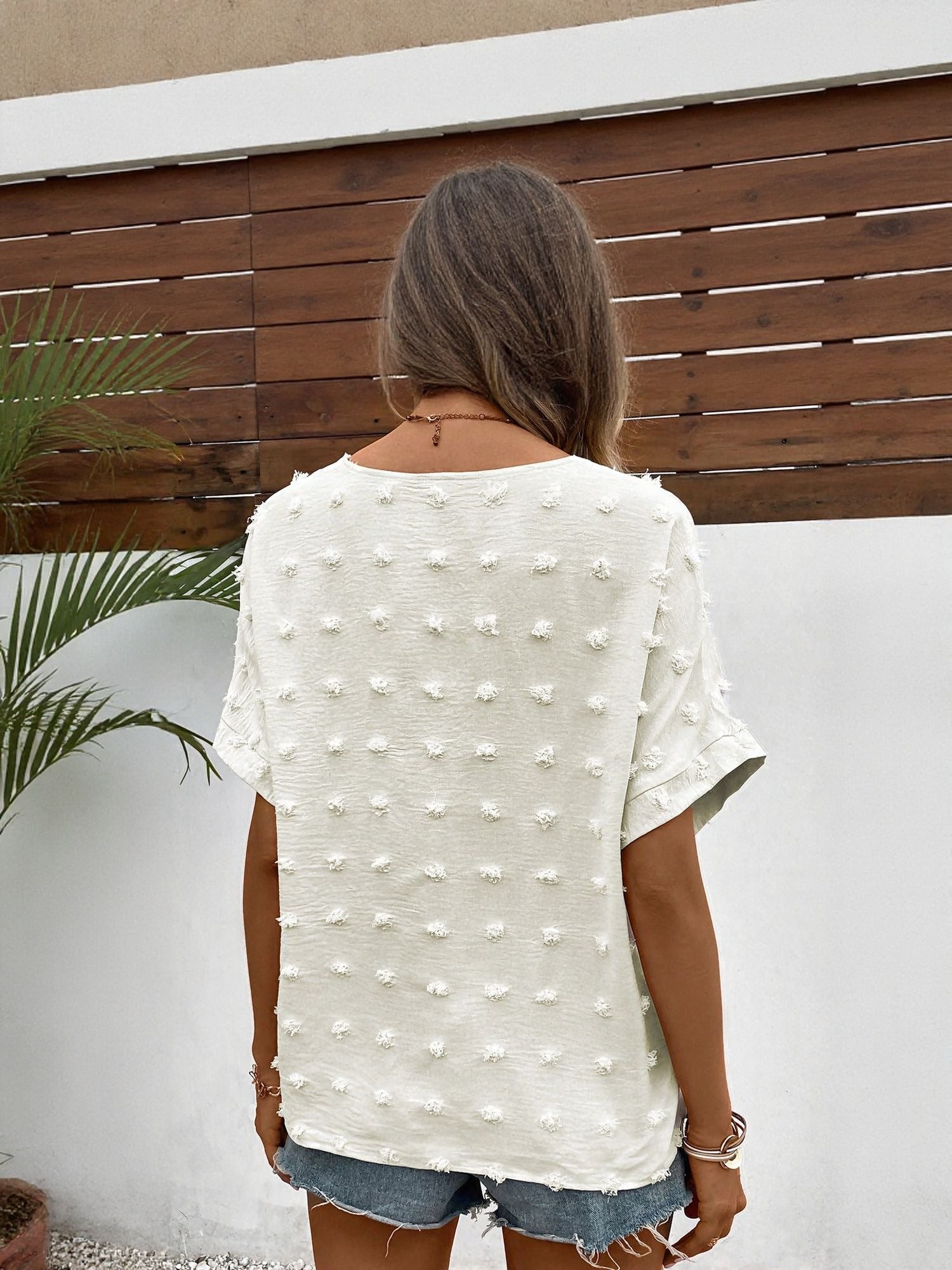 The White V Neck Blouse With Dobby Texture isn’t just a vacay wear, it's your fashion fallback. White brightens up your closet, and the classic cut means it pairs with almost everything.