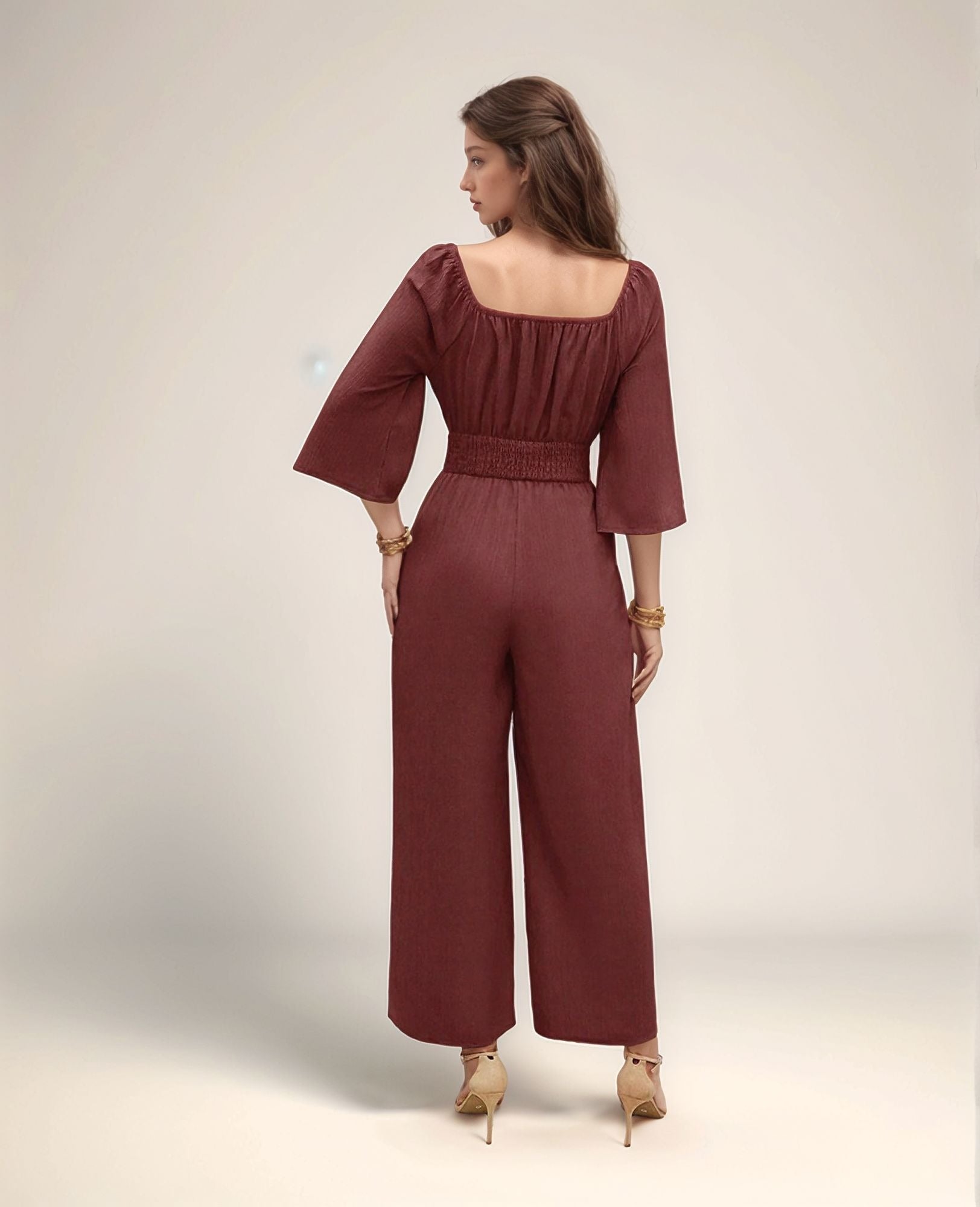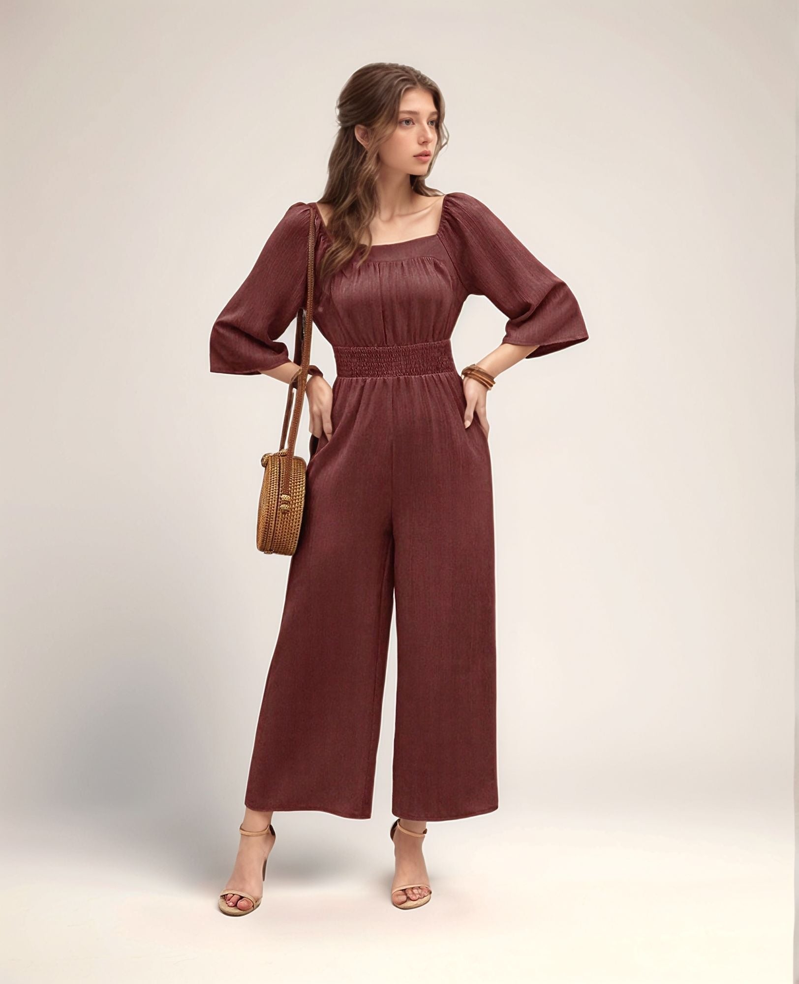 Brown Wide Leg Jumpsuit With Smocking Detail
