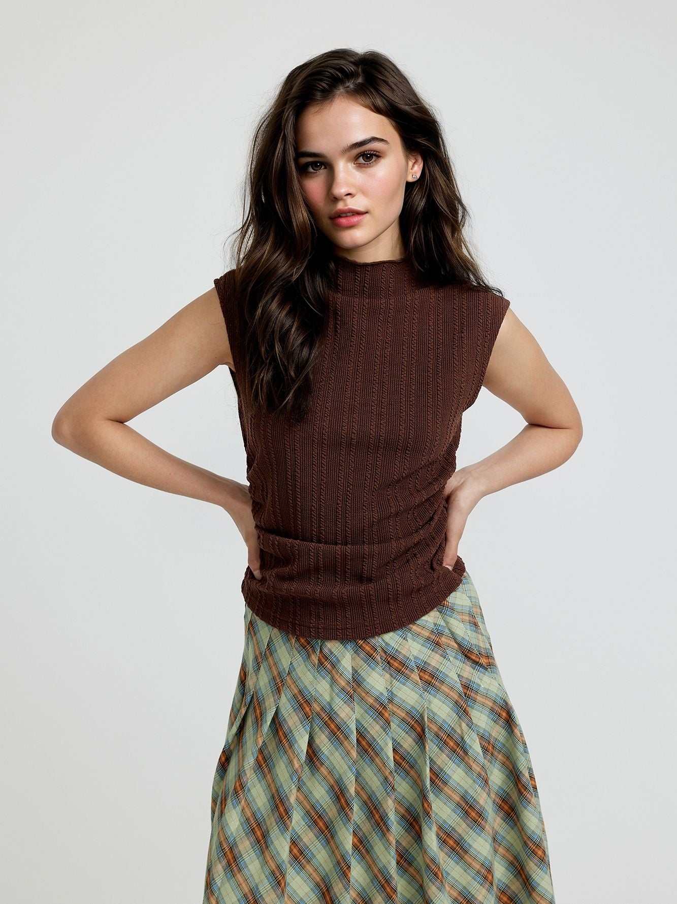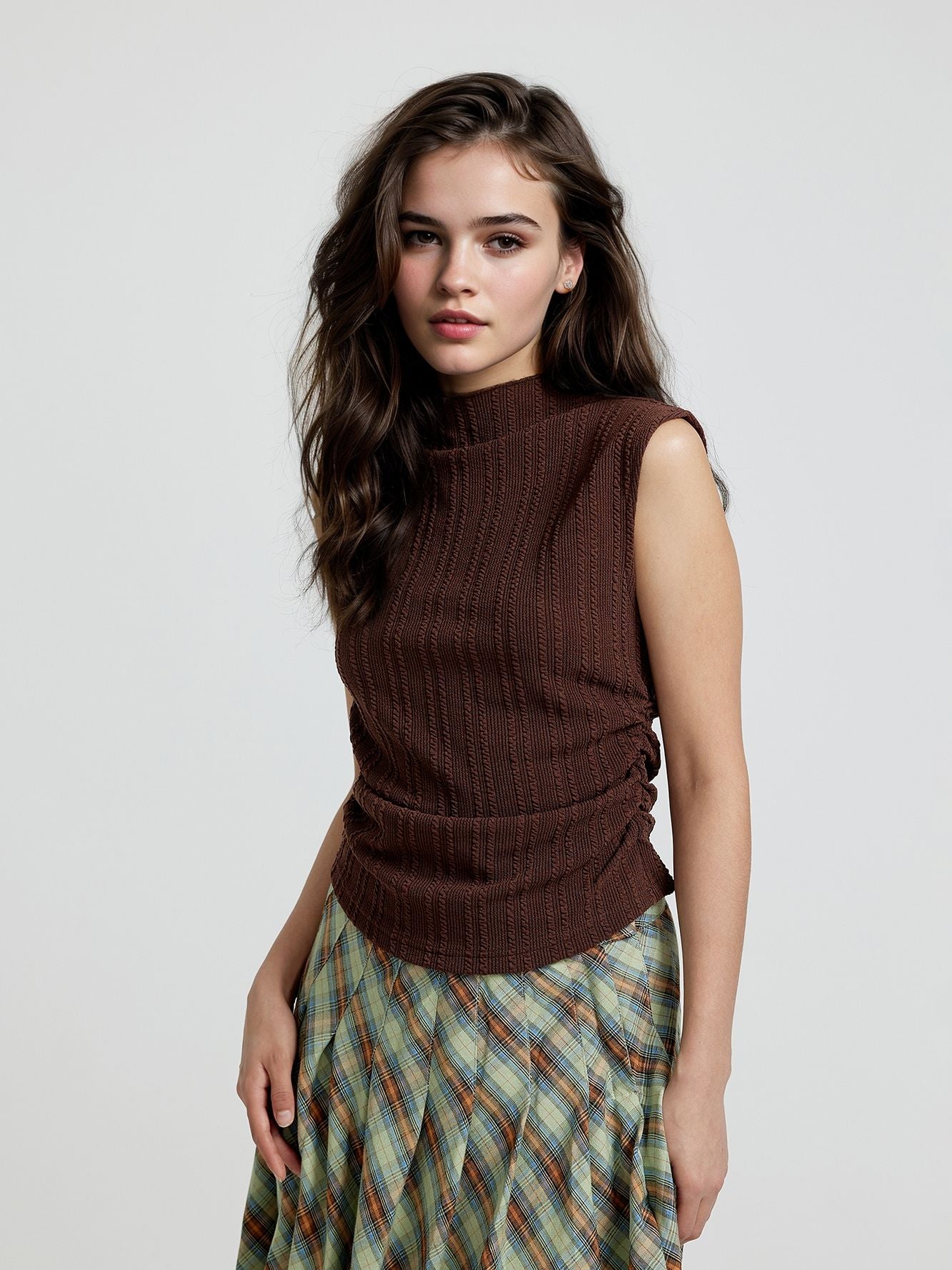 For fits that are low-effort, high impact,the Brown Textured Knit Top With Side Ruching has entered the chat. Made to move through party wear plans with ease, it’s soft, wearable, and made to go out in.