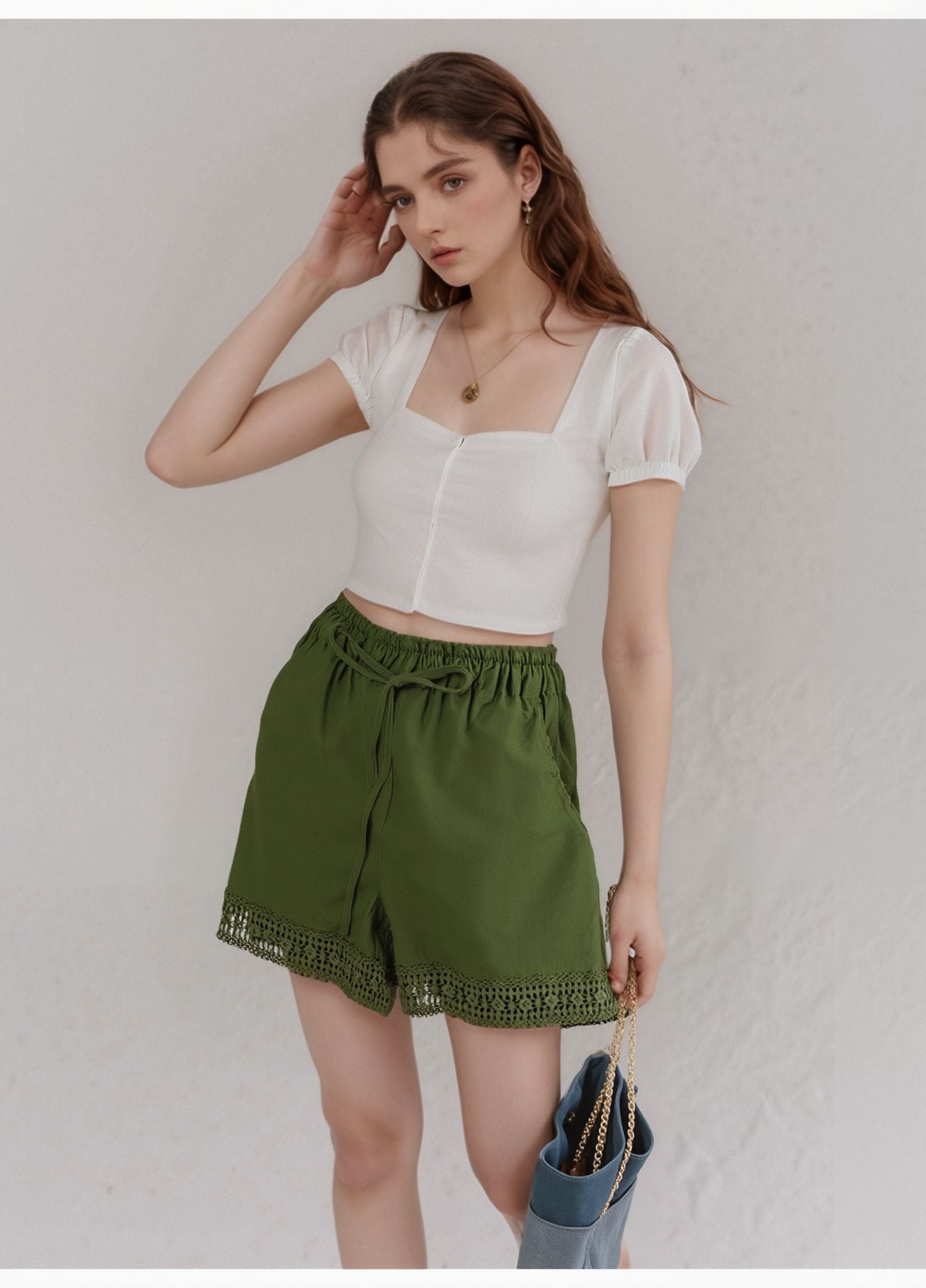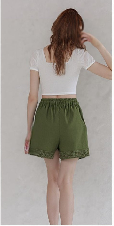 Add a touch of elegance to your casual look with green lace-detailed shorts. Perfect for sunny days or a relaxed vacation, these stylish bottoms combine comfort and sophistication. The intricate lace accents offer a feminine flair, making them ideal for everyday wear or outdoor adventures. A versatile addition to any wardrobe, these shorts promise to keep you cool and chic. Perfect for any casual outing or getaway.