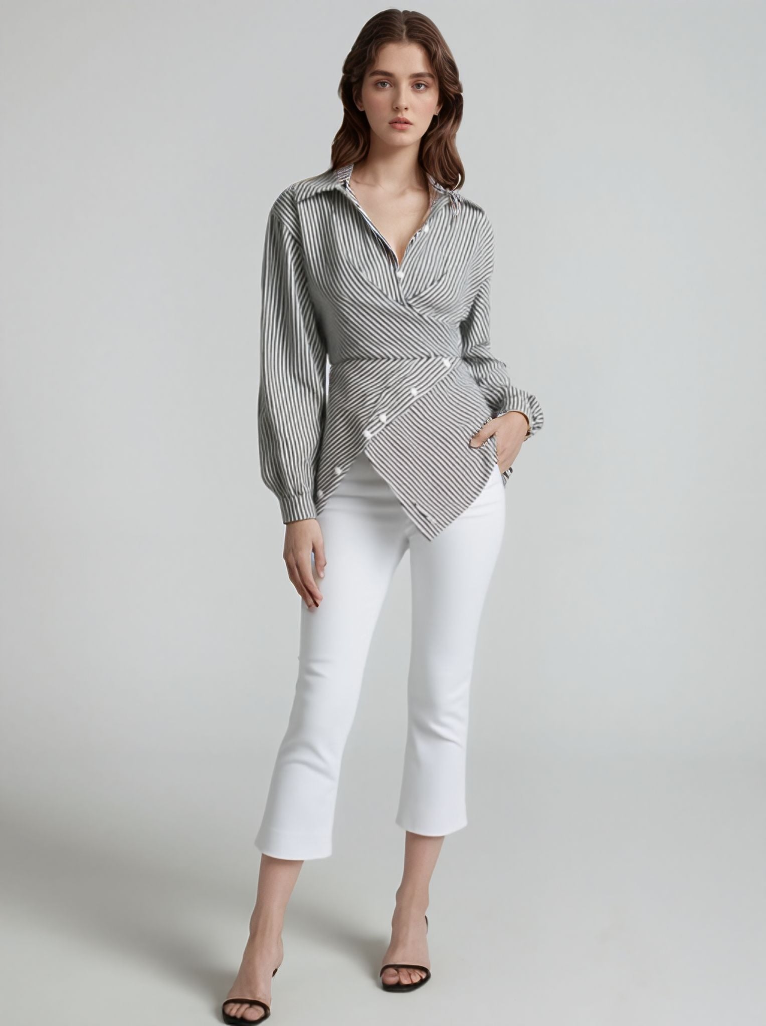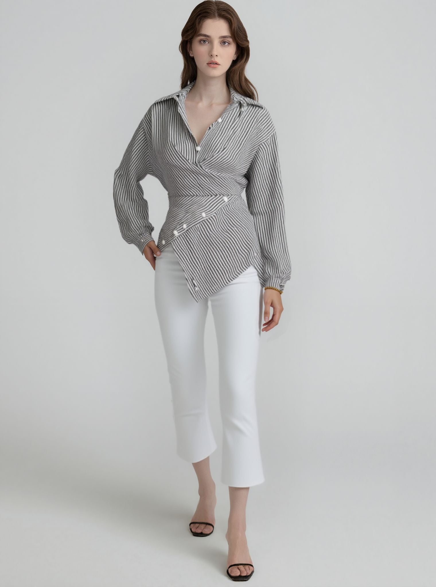 Black Striped Wrap Shirt offers a chic and stylish look for any occasion. Perfect for casual outings or vacay wear, its flattering wrap design and bold stripes add a modern twist to your wardrobe. A must-have addition for women seeking a trendy yet comfortable top.