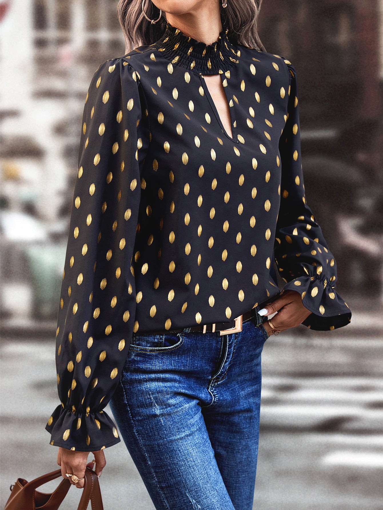 This black full-sleeved retro polka dots top is a stylish choice for any occasion. Its playful polka dot pattern and chic design make it perfect for casual outings or vacation wear. Crafted for comfort and fashion, this top is ideal for women who love trendy and versatile wardrobe pieces.