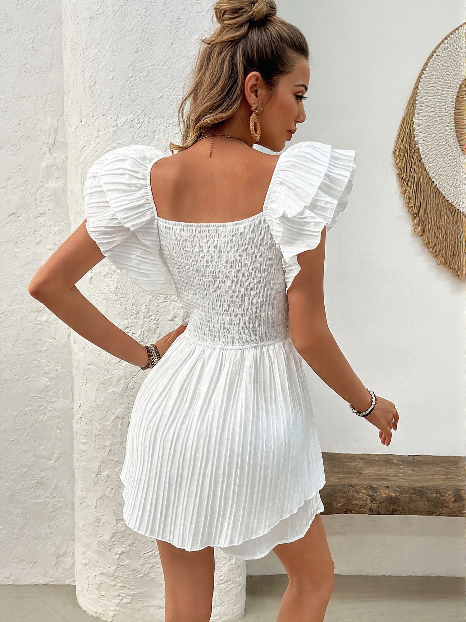 Designed to elevate your vacation moments, White Mini Dress With Ruffled Sleeve is a a-line vacation mini dress that blends comfort with confidence. Its figure-hugging design ensures a flattering shape while giving you full freedom to move. A versatile option for night outs, casual hangouts, or weekend plans, this white mini dress makes getting ready easy. Match it with your favorite footwear and you're out the door.