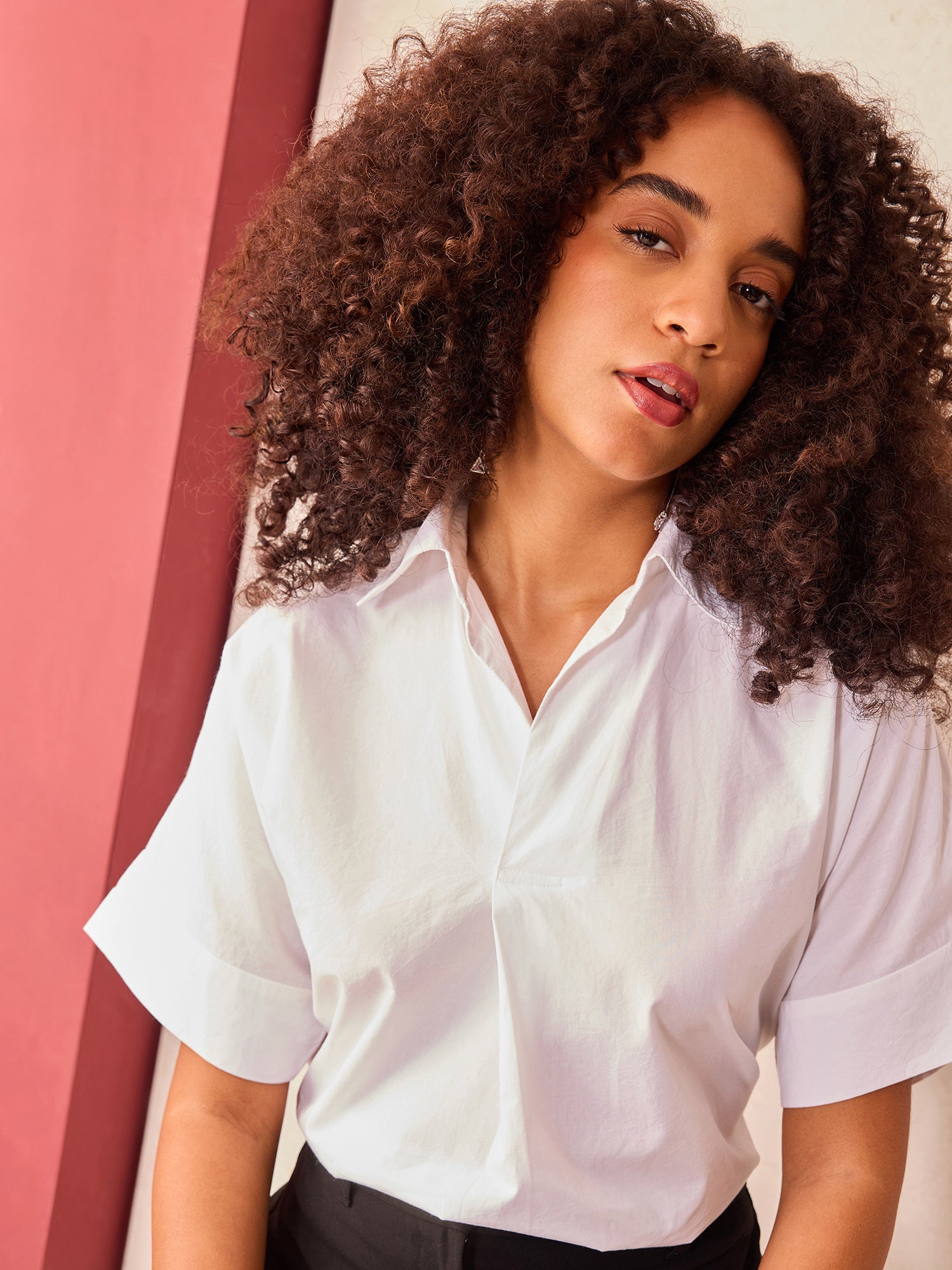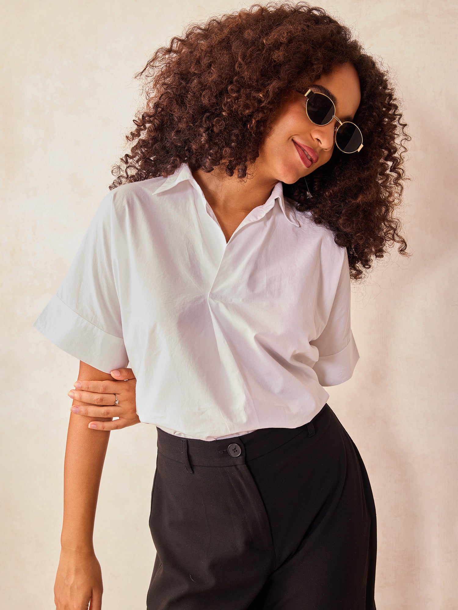 White Beige Boxy Shirt With Rolled Short Sleeves