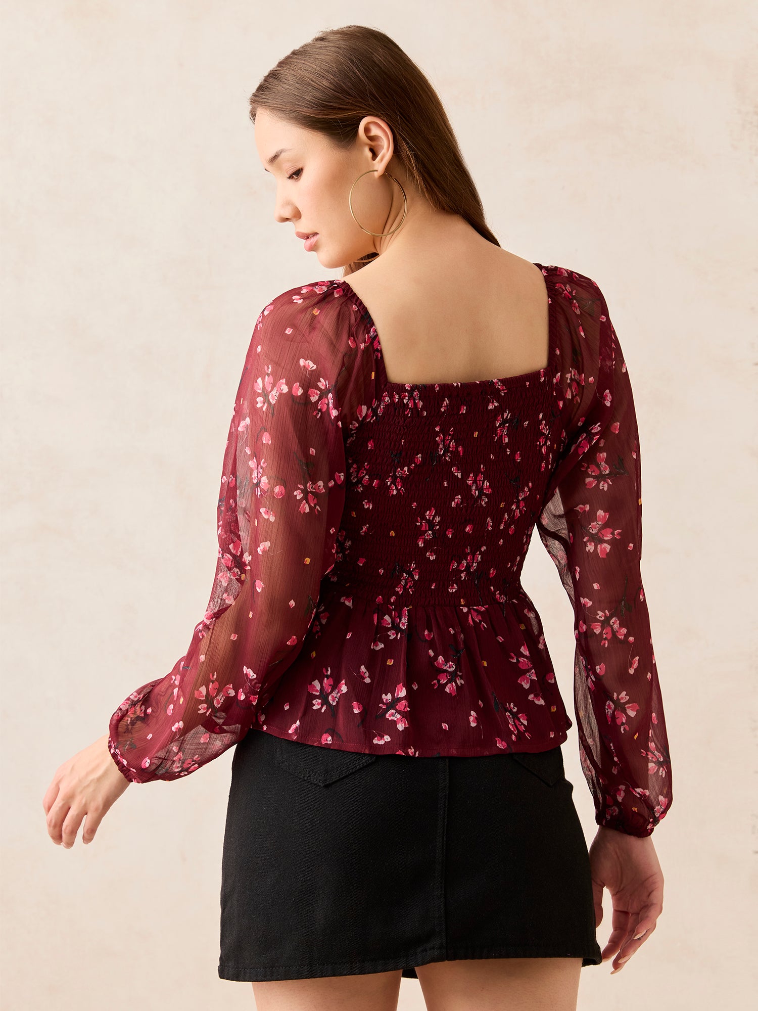 Maroon Printed Smocked Top