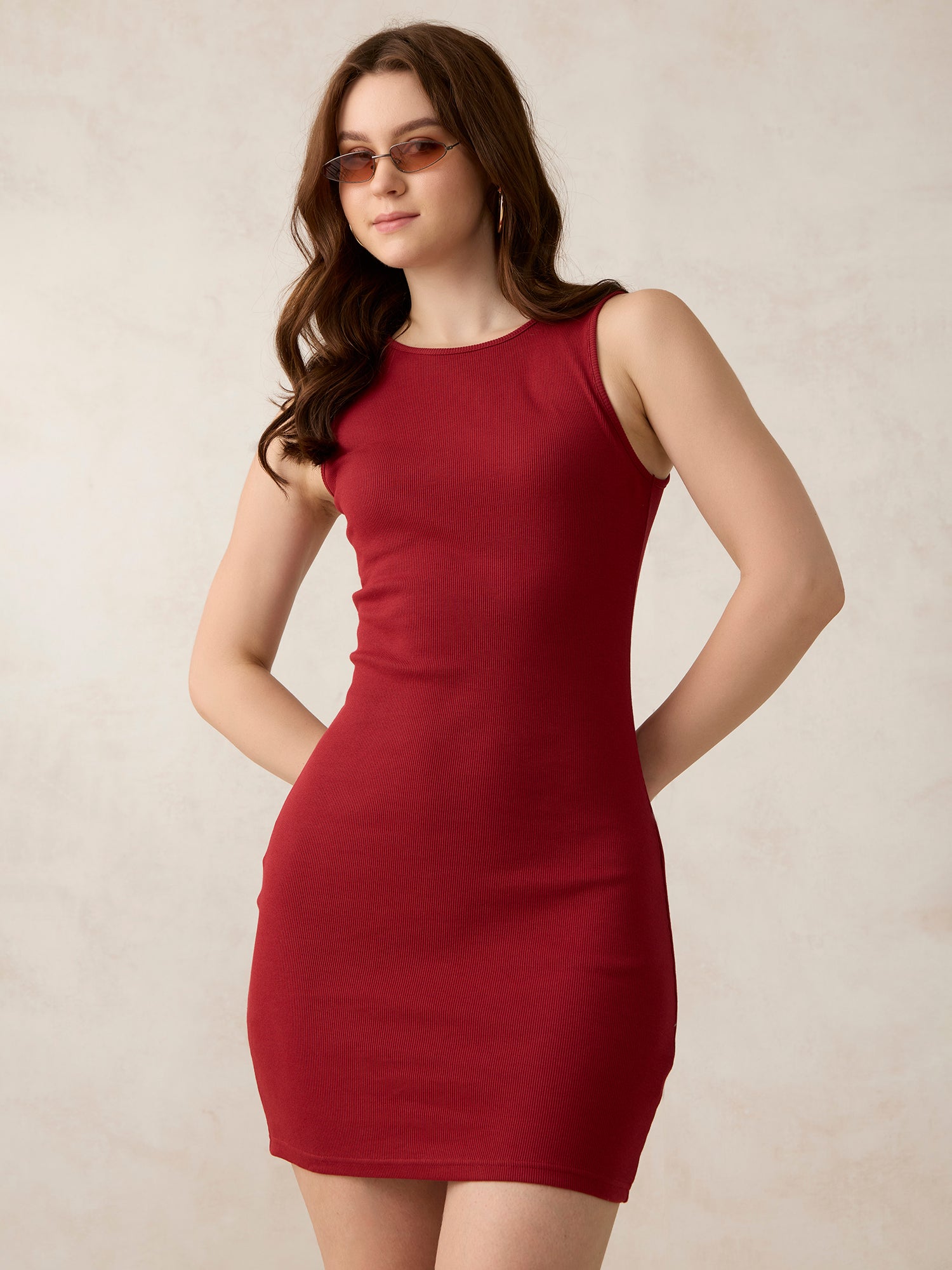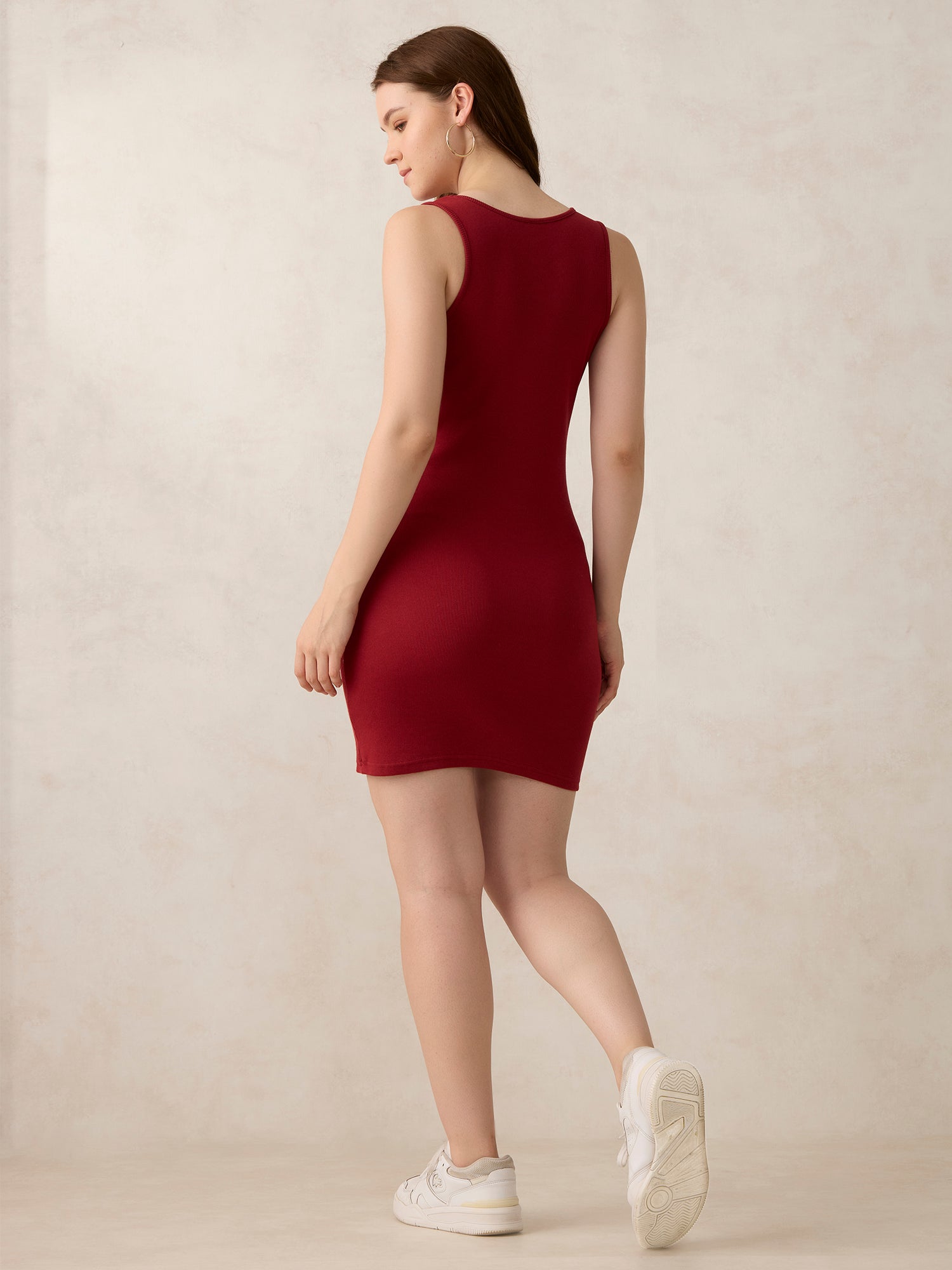 Step into the scene with Maroon Solid Bodycon Tank Dress, a must-have mini dress designed for going-out days. The bodycon silhouette hugs the body for a sleek and defined look. Comfortable yet elevated, it’s ideal for evening events, birthday plans, or your next city outing. Add some glam with accessories or keep it simple,it works either way. A perfect this addition to your occasion-ready wardrobe.
